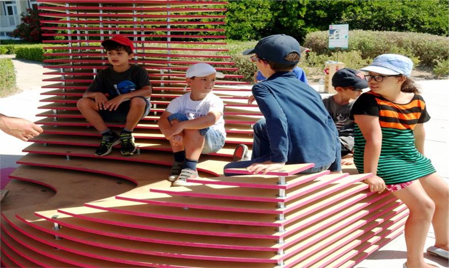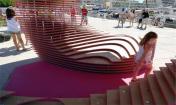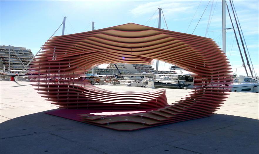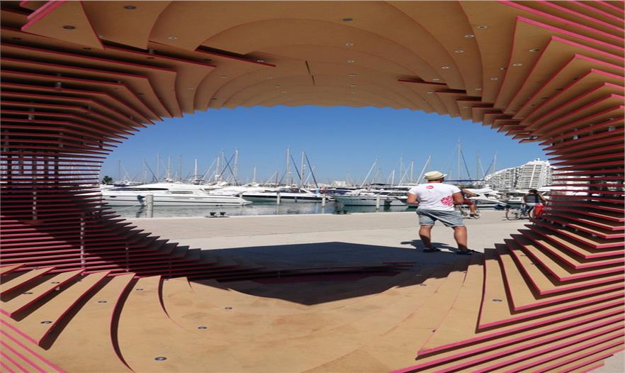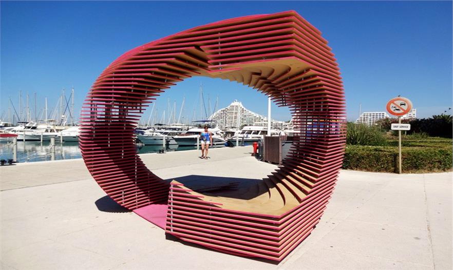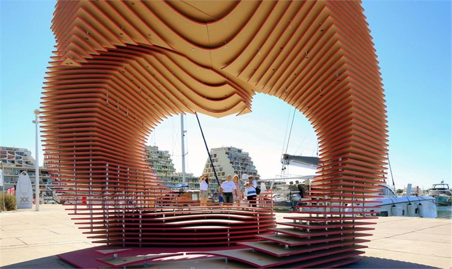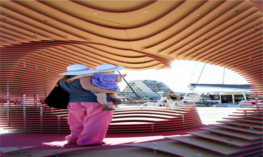 這些嵌板(構(gòu)成這個(gè)裝置的材料)的輪廓通過(guò)借用建筑師珍?巴拉迪爾建筑的有機(jī)形狀和回收港灣周?chē)拇恢匦玛U釋了這個(gè)城市的全景。其起伏的形狀就好像被風(fēng)侵蝕過(guò)的一樣,可以讓人漫步于其中或坐在下面休息。