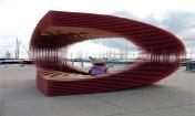 這個(gè)展館的實(shí)驗(yàn)性因素是理念地方化技巧的展現(xiàn)方式:整個(gè)雕塑成為拉格朗德默特海濱上的一個(gè)降號(hào)標(biāo)志、一個(gè)虛擬舷窗。這個(gè)裝置的持續(xù)發(fā)展改變了其自身的特性,由于結(jié)構(gòu)變形,構(gòu)成了一個(gè)完美的圓圈。