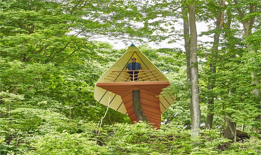 樹屋的施工是由20名日本工匠組成的團隊完成,結(jié)構(gòu)自身已構(gòu)成了鳥的形狀,工匠們在輕松的工作環(huán)境中將設(shè)計師的紙上構(gòu)想變成了真實的三維空間。圖形元素對于他作品中的視覺故事性非常重要,建筑形式轉(zhuǎn)變成環(huán)境,在這里訪客通過視覺上和作為一個觀景的房子與建筑進行互動。