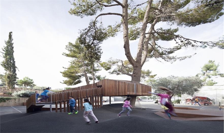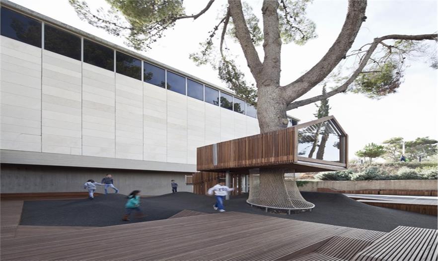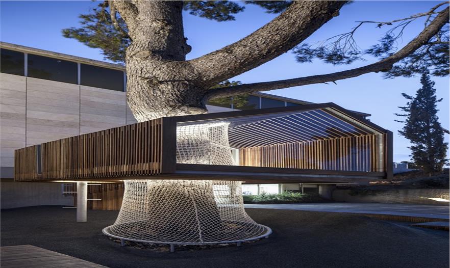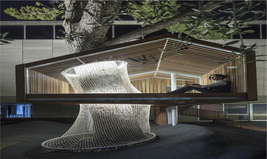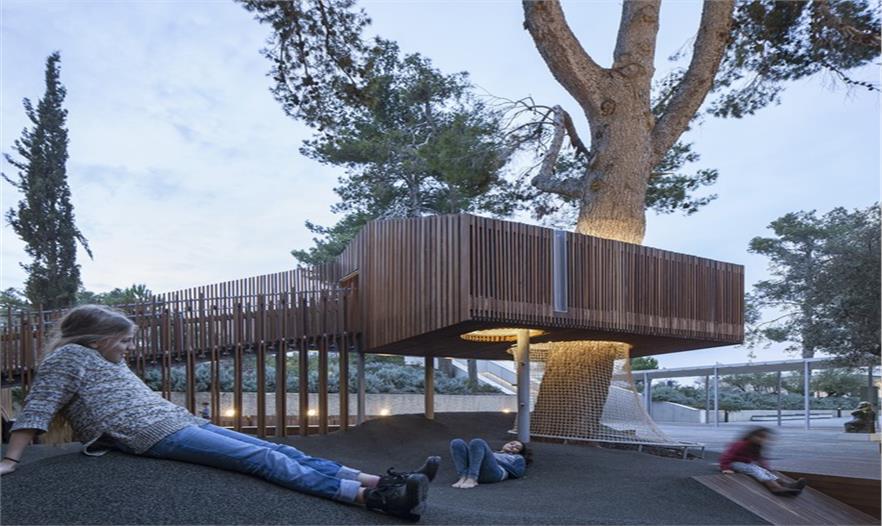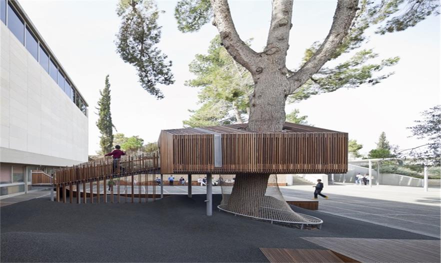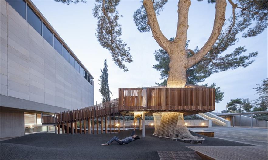 這是一個青年團教育機構有趣的入口景觀設施,該機構位于耶路撒冷以色列博物館。主要來訪者是一些青少年及兒童。主體建筑是由混凝土與石材建造的現(xiàn)代簡約風格建筑,有著干凈簡單的立面。這出小空間圍繞著一顆大樹展開,在不破壞大樹的前提下,營造出一個探索性小樹屋的空間,通過常常的木走到可以走進樹屋,也可以通過其下方的小爬梯爬入。