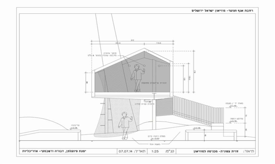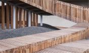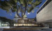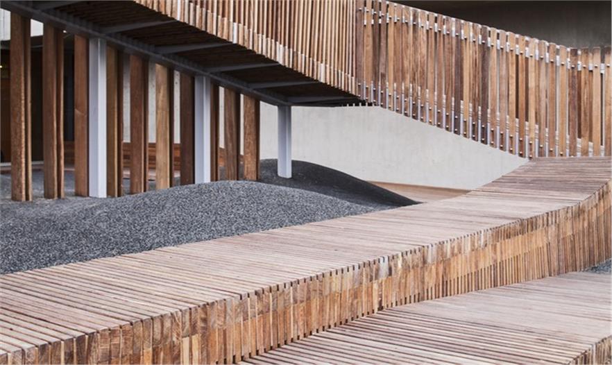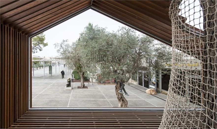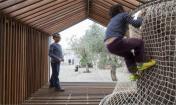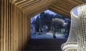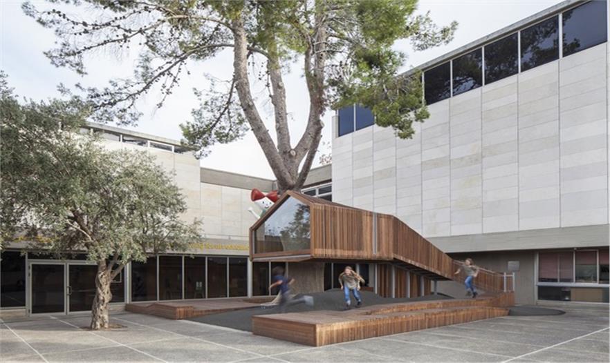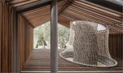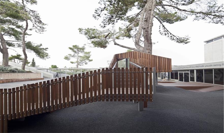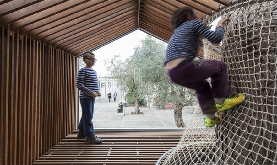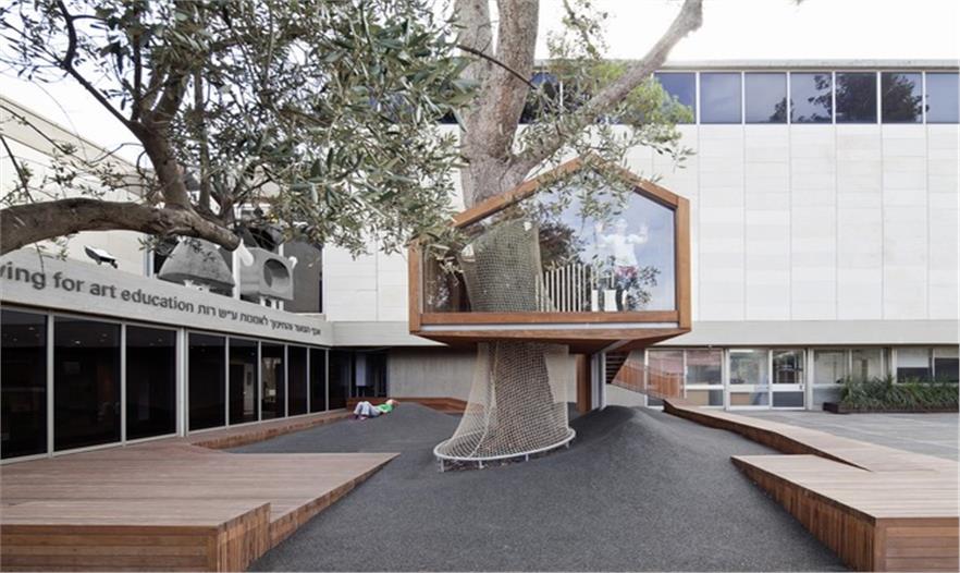 這是一個青年團教育機構有趣的入口景觀設施,該機構位于耶路撒冷以色列博物館。主要來訪者是一些青少年及兒童。主體建筑是由混凝土與石材建造的現(xiàn)代簡約風格建筑,有著干凈簡單的立面。這出小空間圍繞著一顆大樹展開,在不破壞大樹的前提下,營造出一個探索性小樹屋的空間,通過常常的木走到可以走進樹屋,也可以通過其下方的小爬梯爬入。