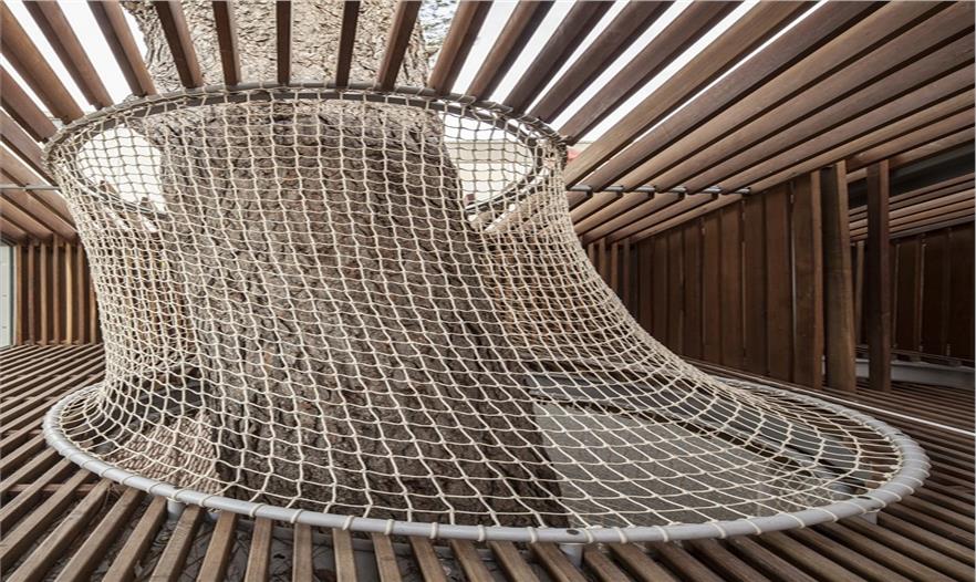 樹屋下方是一片高低起伏曲面的玩耍區(qū),由EPDM橡膠鋪設而成,柔軟適合坐臥。設計師Ifat Finkelman與Deborah Warschawski 為了進一步保護大樹的“皮膚”還非常貼心地為其穿上了半截“絲襪”