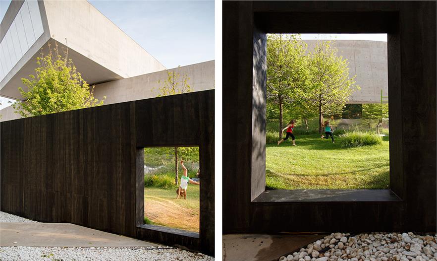 這塊地在一個(gè)大的長(zhǎng)方形底盤內(nèi),長(zhǎng)方形的兩條短邊為開放式。這個(gè)容器的人造特征體現(xiàn)在其木質(zhì)結(jié)構(gòu)和表面處理上, 與內(nèi)部的田園景觀形成了強(qiáng)烈的視覺對(duì)比。