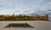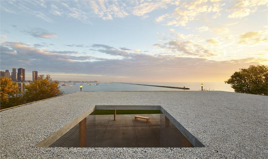 至簡的形態(tài)放大了它所蘊含的精妙的、多樣的實驗。水平的屋面設(shè)計,建立在對芝加哥的兩個標(biāo)志性景觀——密歇根湖和城市天際線進(jìn)行反復(fù)校準(zhǔn)的基礎(chǔ)上。站在地面上,密歇根湖的水平面恰好位于地面和屋頂?shù)恼?。站在觀景平臺上,屋頂變?yōu)橐粭l人工的水平線,切斷遠(yuǎn)處的景觀,強(qiáng)化了位于抽象平面上的垂直的天際線。