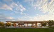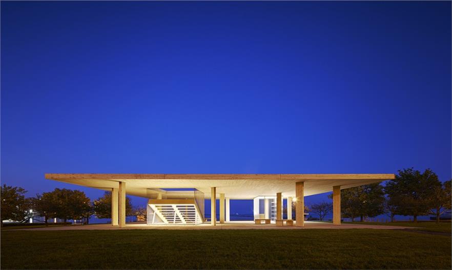 建筑師從兩個誕生于芝加哥的原型:Mies van der Rohe對超平的實驗和Eames在短片《Powers of Ten》中對尺度的探討中得到啟發(fā),設(shè)計了一座最大凈跨度的56英尺見方的開放式屋面,它既有密斯式理性主義的一面,又有和美國式的即興與樂觀的一面。