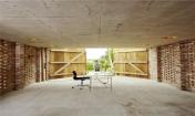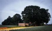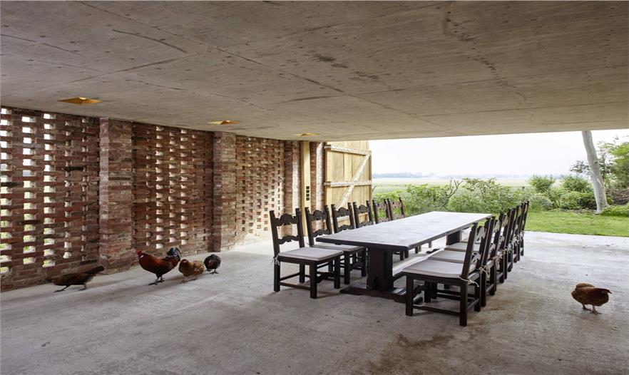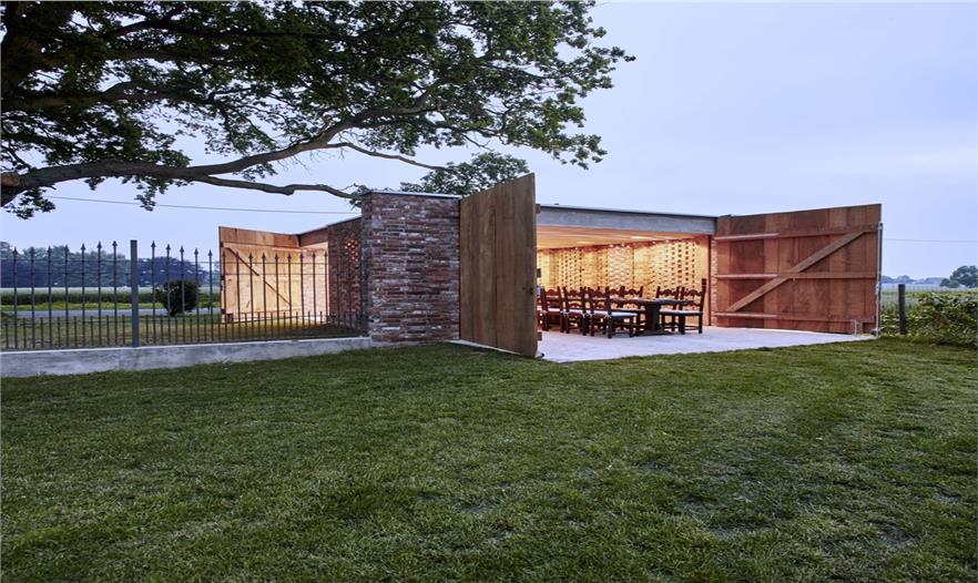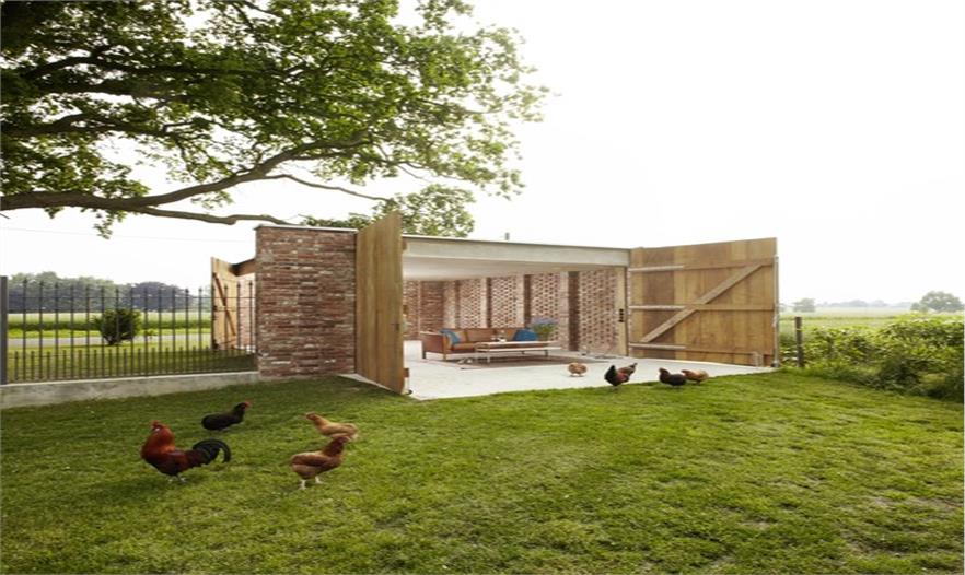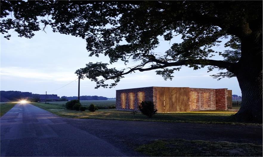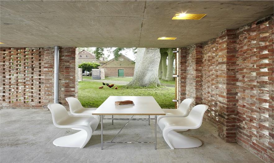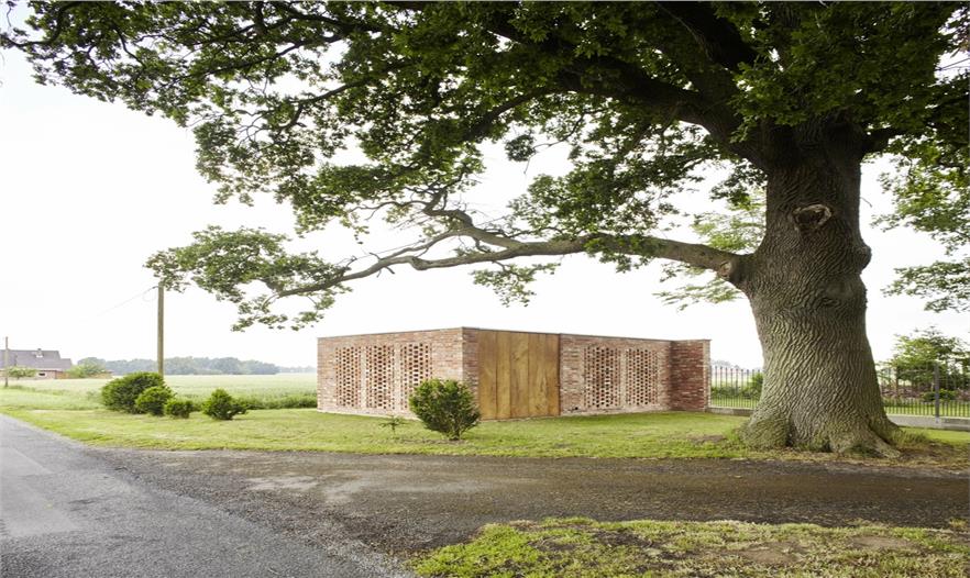 Remisen亭是一座典型的德國(guó)薩克森農(nóng)場(chǎng)建筑,延續(xù)了現(xiàn)有建筑的傳統(tǒng)形式、尺度和材料。新的亭子成為了農(nóng)場(chǎng)新的焦點(diǎn),你在接近農(nóng)場(chǎng)第一眼就可以看到。從遠(yuǎn)處看這座亭子就像是一個(gè)巨大而封閉的方形。但是走近之后就可以看到這座建筑精致的磚砌表面,角部包裹了木材,并且具有從地板到天花板通高的大門。新的亭子利用了防火木材,這是一種常用材料不太需要維護(hù),它在夏天可以停放車輛,而當(dāng)沒(méi)有東西的時(shí)候可以用作一個(gè)接待室。建筑使用的磚是從周邊一座廢棄建筑中取下的。門上所使用的橡木木材是在15年前于一片草地上砍伐的。利用電鋸被切成了寬厚的木板。