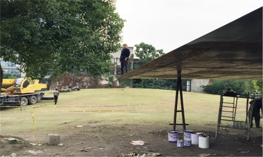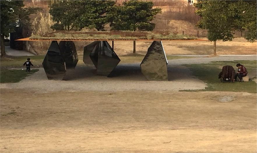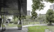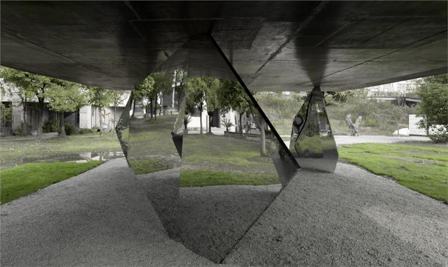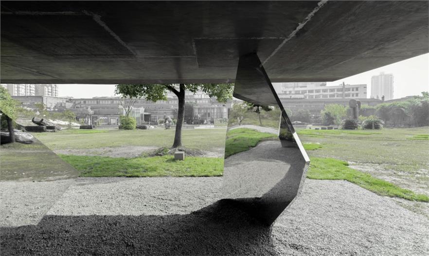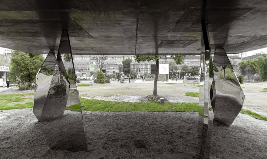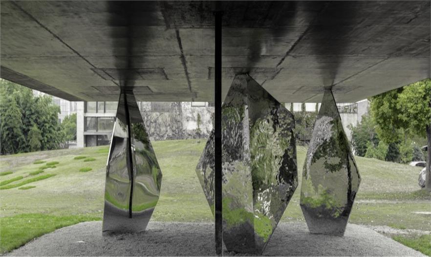 然而建筑師在確定支撐位置時并非依據的結構最合理原則,此時在建筑師腦中的是一個由假山的“切片”來支撐及限定的空間,就像藝術家對待薄片不銹鋼的材料手法一樣,工程學的支撐結構被帶入了假山的空間意味,建筑師將藝術家的不銹鋼假山雕塑,分解及轉換為一個抽象的假山般的空間。藝術家特意選擇了山石拓片肌理的不銹鋼作為切片一側的表面,周邊的樹木花草被模糊化地帶入了這個花草亭中。因由藝術家的介入,建筑師得以這樣一種當代的方式進入有關原始空間的修辭學中。