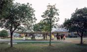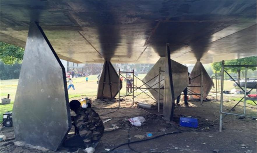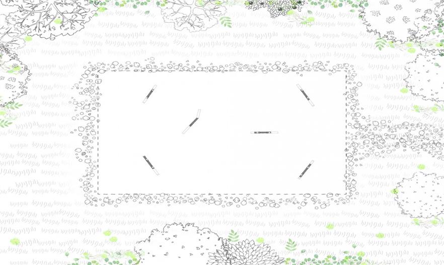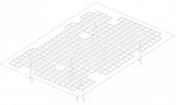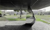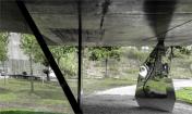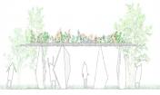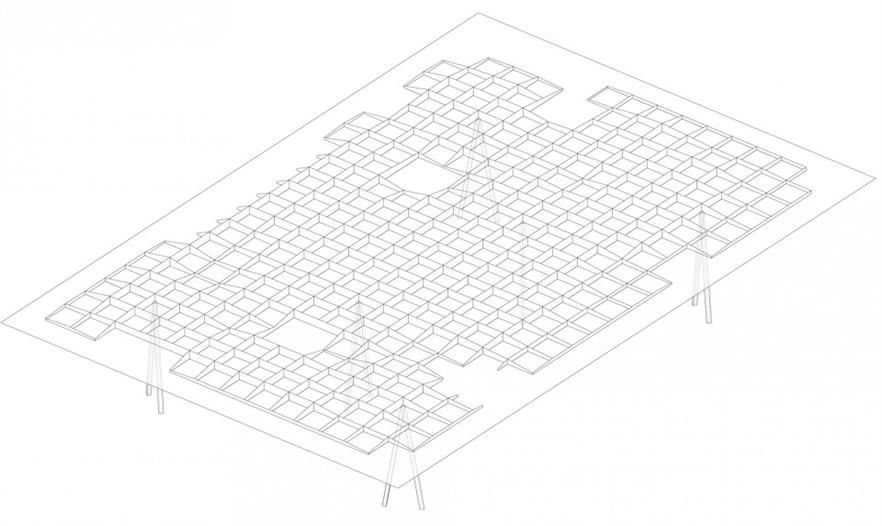 支撐與覆蓋是人類最原始的空間建造模式,用以庇護自身免受日曬雨淋。在人類建造的演進中,人們傾向于合理和科學的準則,工程學逐漸成為建造的技術核心?;ú萃ひ步涍^嚴謹的結構計算,12米x8米大小的覆蓋,由8mm和14mm兩種厚度不等的鋼板在800x800mm的網格內根據受力分布組合而成,鋼板上部根據受力設置了50-200mm高度不等的厚度為14mm的云狀肋板,(這些肋板間的空間就作為了屋面種植的花池,結構受力的狀態(tài)形成了一個天然的地形坡度),鋼板下部則根據空間需要布置了6處60mm見方的單根或A形實心方鋼支撐,于是一個密斯式的極簡工程建造物已然完成。