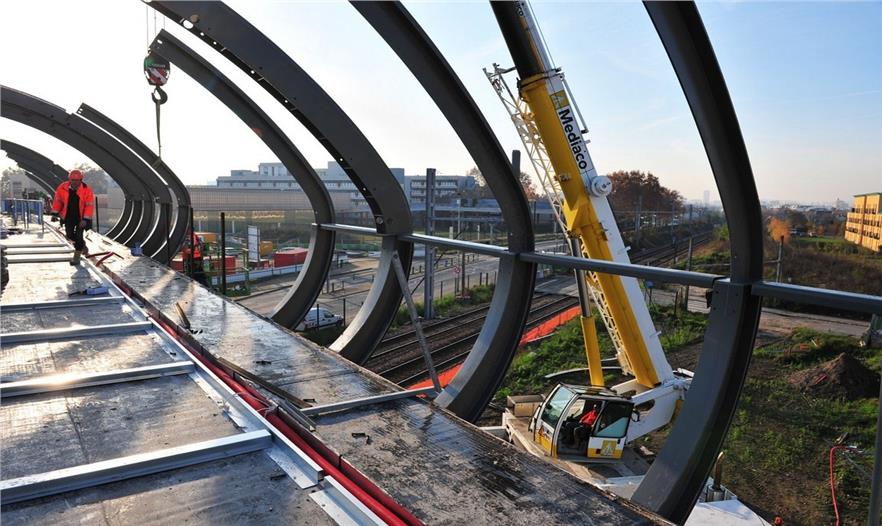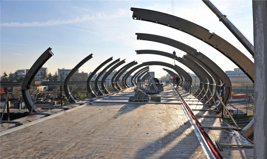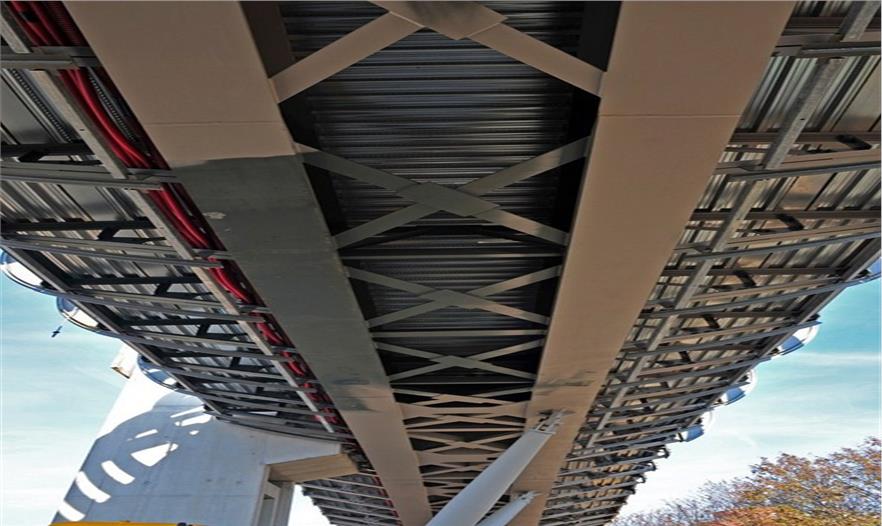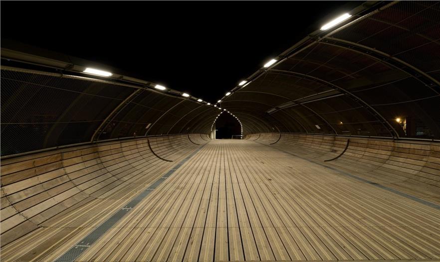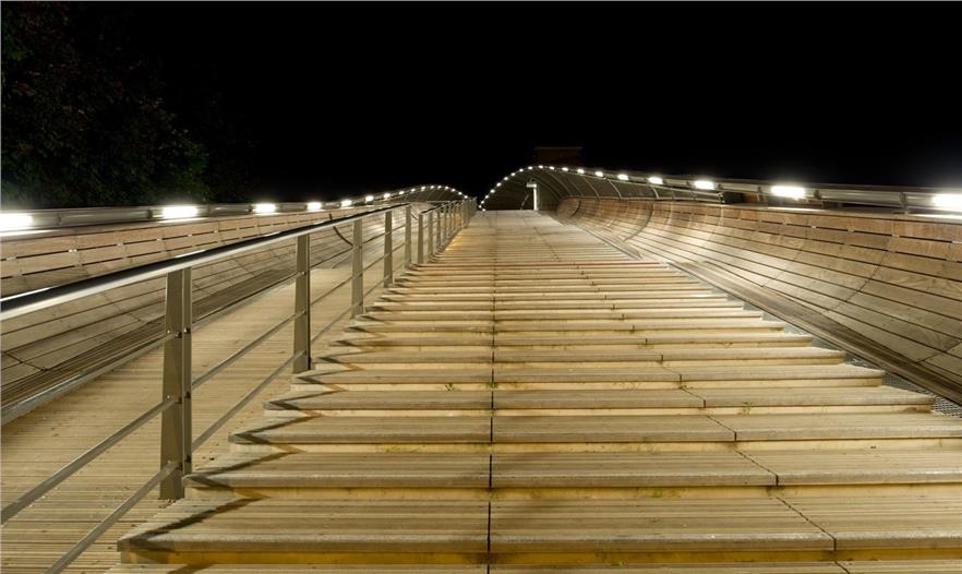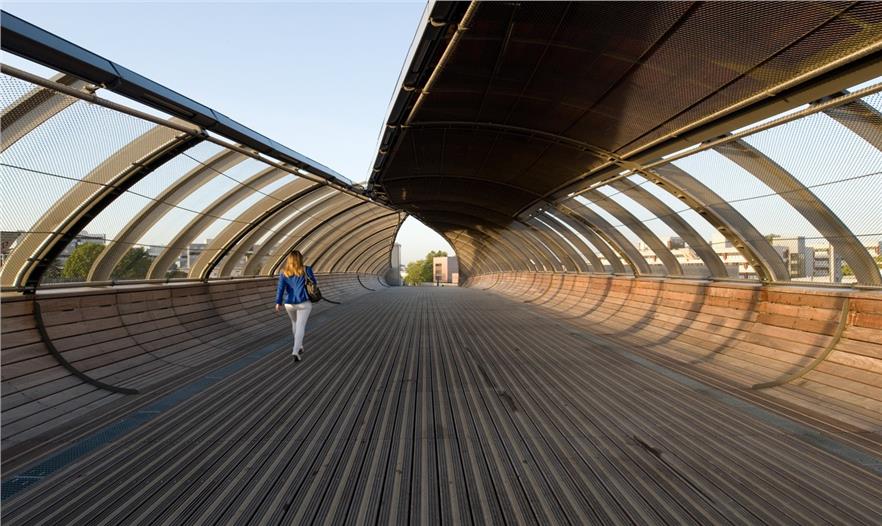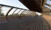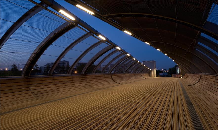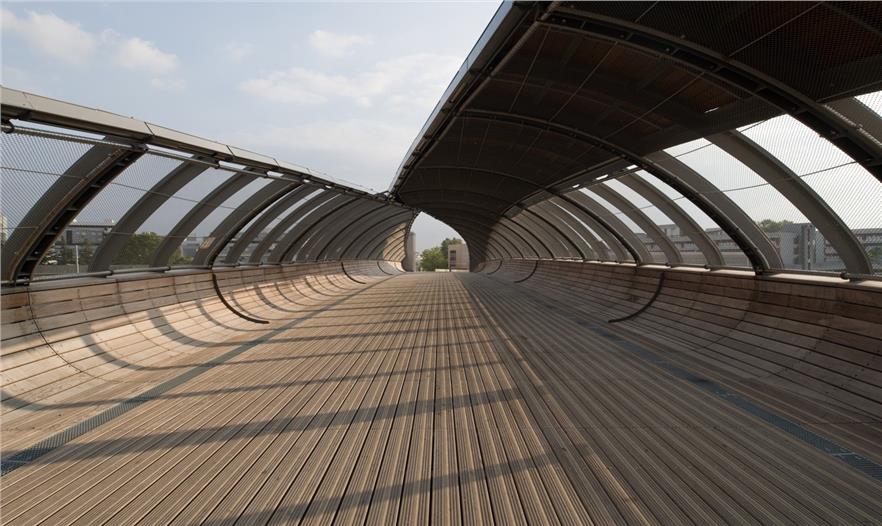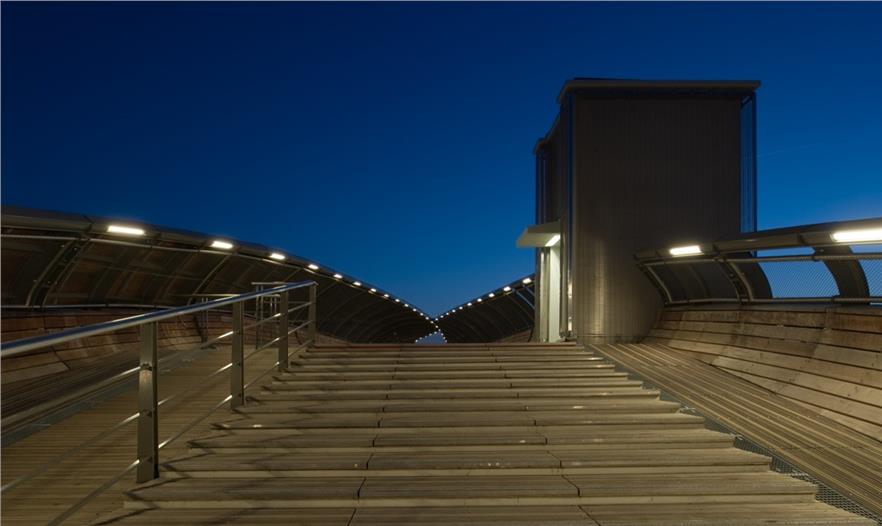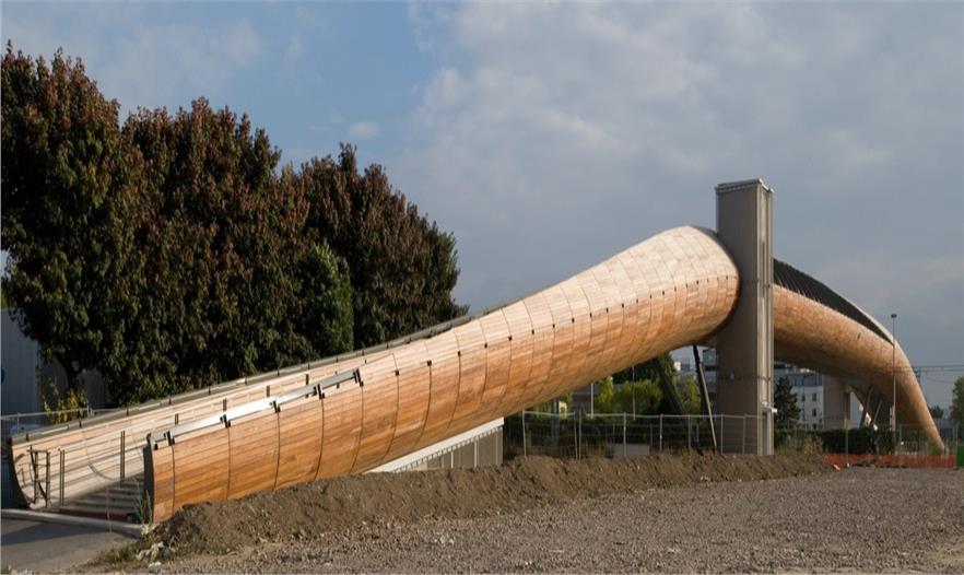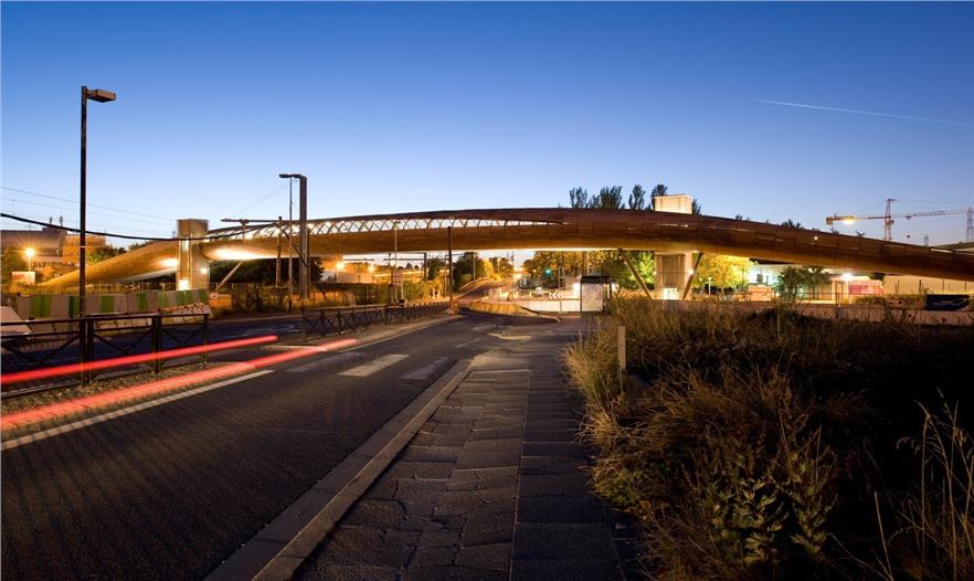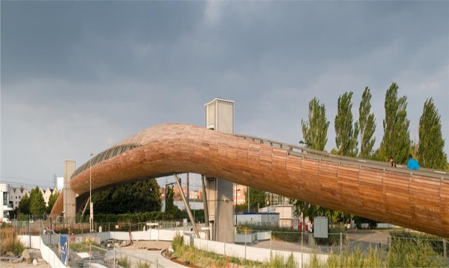 期待已久的維爾塔奈斯大學道路立體樞紐現(xiàn)在已經(jīng)成型。盡管在城市發(fā)展的角度上看它是一件好事,但隨后的交通路網(wǎng)的集中也加劇了南北之間的分裂。因此,人行橋有兩重角色:直達車站的通路和鄰里街區(qū)的樞紐。它不僅是道路立體樞紐,同時還作作為南北之間的城市連結(jié)體改善交通流。作為城市地標,它必須為城鎮(zhèn)的重要空間和建筑清除視線障礙,如:市政廳,大學,航運中心,立交橋,等等。為了讓步行橋使用起來更加自然,從墩距和寬度上看,我們將它設(shè)計成從地面破土而出,保護行人不受頭頂電線和大雨的危害。這使得這座步行橋很像植物,很像一片葉子沿長邊蜷曲舒展。由于它宜人的尺度(156米長8米寬)和外部的開放性,還有經(jīng)森林管理委員會認證的木質(zhì)表皮,都讓你能在上面展開一段舒適的浮橋之旅。