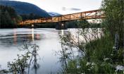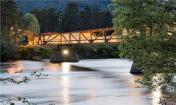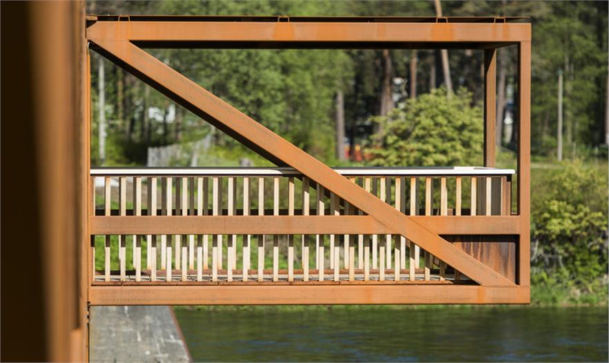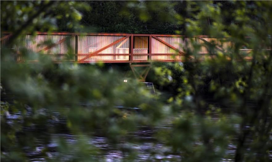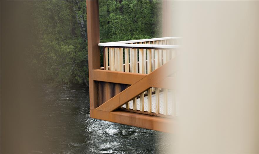 在2015年春季,位于挪威西部的 Voss 市邀請(qǐng)開發(fā)商與建筑師參與一座位于 Vosso 河上的步行橋招標(biāo)。這座橋旨在取代前一年被洪水破壞的舊橋。由IKE鋼結(jié)構(gòu)與立面公司, SK Langeland與 Rintala Eggertsson Architects事務(wù)所組成的團(tuán)隊(duì)贏得了這場(chǎng)競(jìng)賽,他們的作品采用了考登鋼格柵與木制地板、墻體與天花。