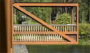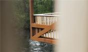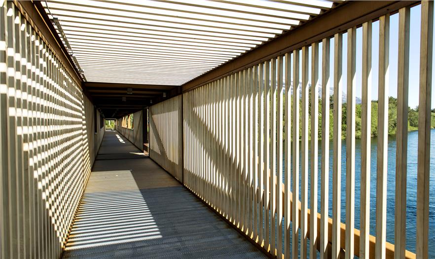 對(duì)于業(yè)主來說,在橋梁上足以遠(yuǎn)觀周圍生機(jī)勃勃的大自然是十分重要的。這條河流本身也是釣魚勝地,成為了當(dāng)?shù)鼐用褚淮髪蕵坊顒?dòng)場(chǎng)所,而那座舊的步行橋就提供了釣魚活動(dòng)的場(chǎng)所。這一點(diǎn)是市政當(dāng)局希望整合進(jìn)橋梁設(shè)計(jì)中的。新橋梁的設(shè)計(jì)嘗試用模數(shù)的節(jié)奏變化來跨越這條河流,從而打破間隔,同時(shí)解決過河時(shí)的單調(diào)。這一模數(shù)的變化是以舊橋現(xiàn)存墩柱的距離為基準(zhǔn)的。主要鋼結(jié)構(gòu)形成了基本韻律,木結(jié)構(gòu)則成為第二主題,類似于打擊樂器組。柱頂?shù)膬蓚€(gè)空間則成為韻律之間的間歇,成為線性主題里的一個(gè)個(gè)休止符,同時(shí)也讓人更容易在這些空間貼近自然。這些空間同時(shí)也是理想的釣魚場(chǎng)所,并且釣魚不會(huì)與行走活動(dòng)互相干擾。被洪水沖走的舊橋是一座帶有明確視覺語言的懸架橋。這一特點(diǎn)成為我們?cè)O(shè)計(jì)新橋的開端。但考慮到現(xiàn)有的鋼與木兩種材料,我們便自然地將其做了室內(nèi)外的區(qū)分,賦予兩種材料不同的角色。鋼材將在外部表現(xiàn)結(jié)構(gòu)承重的原始力量,而木材則在內(nèi)部形成親切尺度的情感交流。