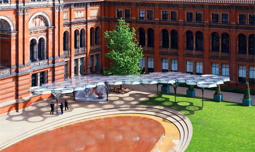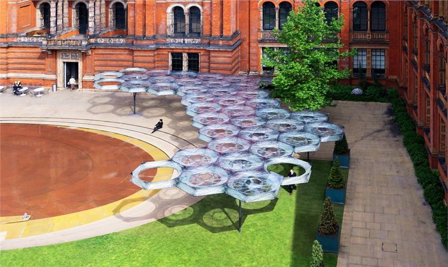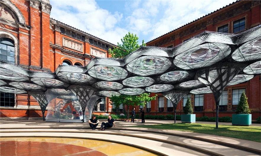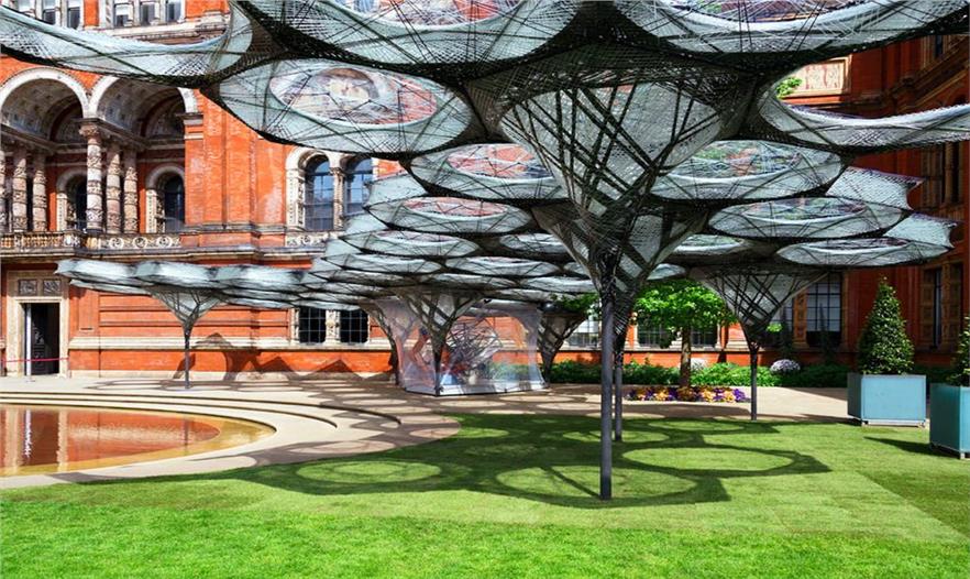 在倫敦的維多利亞和艾伯特博物館花園里矗立著一個(gè)鞘翅細(xì)絲亭,這個(gè)2000平方英尺的冠形結(jié)構(gòu)的命名和設(shè)計(jì)來源于甲蟲的鞘翅,這種昆蟲雙層前翼的纖維。但是它還沒有完工。在未來數(shù)月內(nèi),該結(jié)構(gòu)的增長將適應(yīng)來訪的人群。單獨(dú)看來,這個(gè)亭子也是威風(fēng)凜凜。該結(jié)構(gòu)40個(gè)輕量級(jí)部件在整個(gè)花園廣闊的草坪上投下一個(gè)巨大的幾何陰影。但它的工程學(xué)令人印象更加深刻。每一個(gè)六角形模塊都由一個(gè)巨大的機(jī)械臂組裝出一個(gè)雙層碳纖維和玻璃纖維。每個(gè)模塊的重量只有99磅,整個(gè)5400磅的結(jié)構(gòu)僅相當(dāng)于21平方英尺的博物館的石頭立面。這使得鞘翅在每平方英尺輕了約100倍。但該館的前40個(gè)模塊只是第一步。“你可以認(rèn)為這個(gè)亭子是個(gè)活體實(shí)驗(yàn),花園就是它的實(shí)驗(yàn)室”,斯圖加特計(jì)算機(jī)設(shè)計(jì)研究所所長阿希姆·門格斯說道。在接下來的幾個(gè)月里,門格斯的團(tuán)隊(duì)將添加新的模塊,使之看起來非常不同,兩個(gè)新的數(shù)據(jù)將被帶入到造型中:氣溫和施加在亭子上的力等環(huán)境因素,和那些與它互動(dòng)的人的行為。這個(gè)冠形結(jié)構(gòu)本身已經(jīng)收集了數(shù)據(jù)。這聽起來不可思議,但它真的令人驚嘆:嵌入在鞘翅亭的熱成像攝像機(jī)追蹤訪問者的運(yùn)動(dòng)——去哪里、逗留時(shí)間、人群喜歡在哪里聚集??椚虢Y(jié)構(gòu)的光纖傳感器測(cè)量溫度和內(nèi)部受力。門格斯表示該數(shù)據(jù)將使他的團(tuán)隊(duì)使用環(huán)境和人為因素生成一種計(jì)算方法來決定新的構(gòu)造,并現(xiàn)場(chǎng)裝配。這些新模塊會(huì)是什么樣子?“你要在兩個(gè)月后問我”,門格斯說?,F(xiàn)在,這個(gè)亭子仍將留在花園里,作為一個(gè)有很多增長潛力的優(yōu)秀場(chǎng)所。