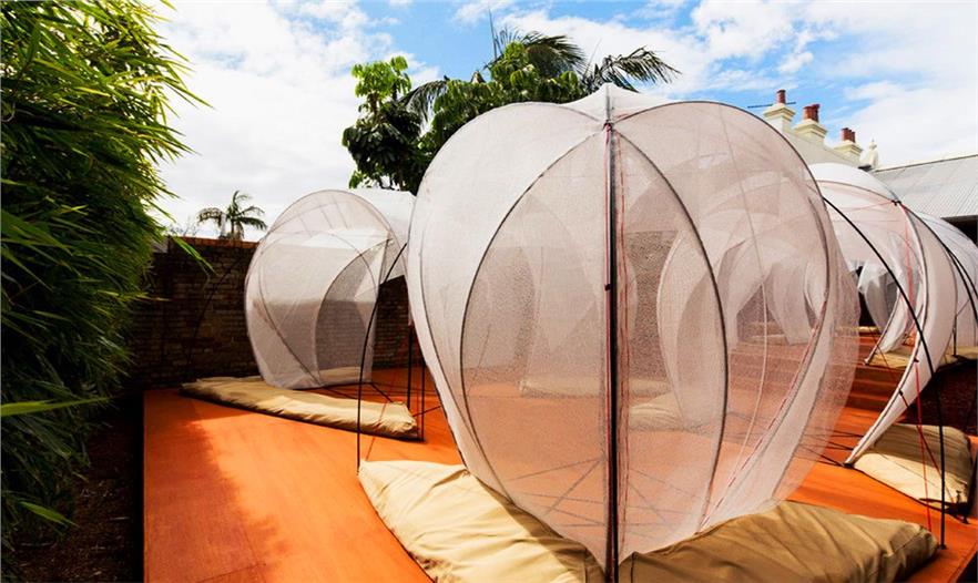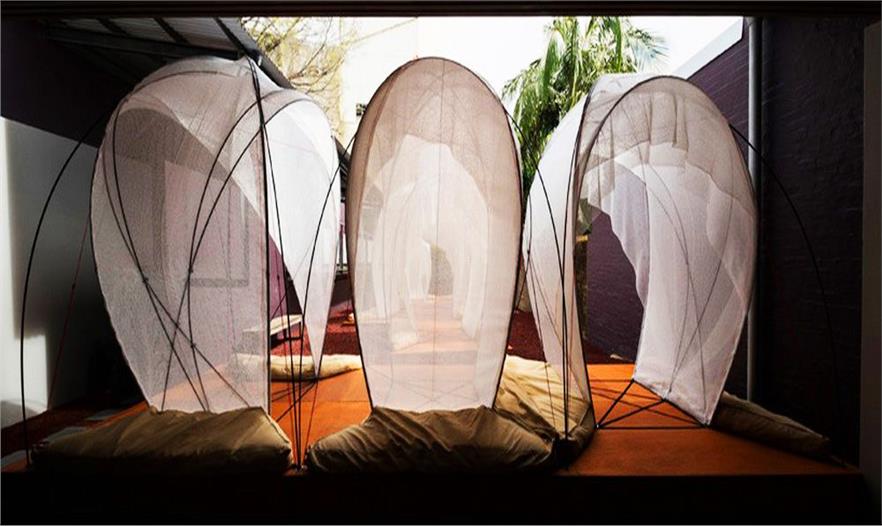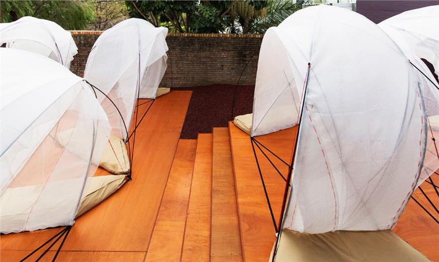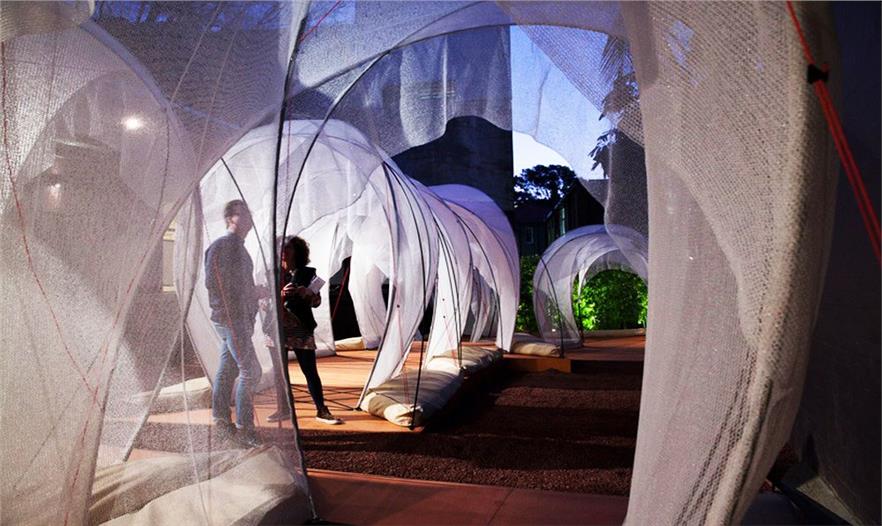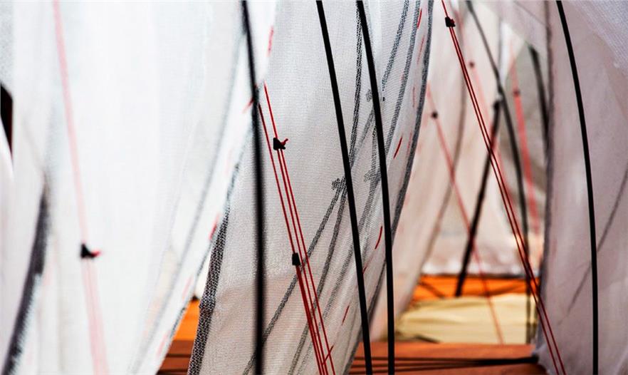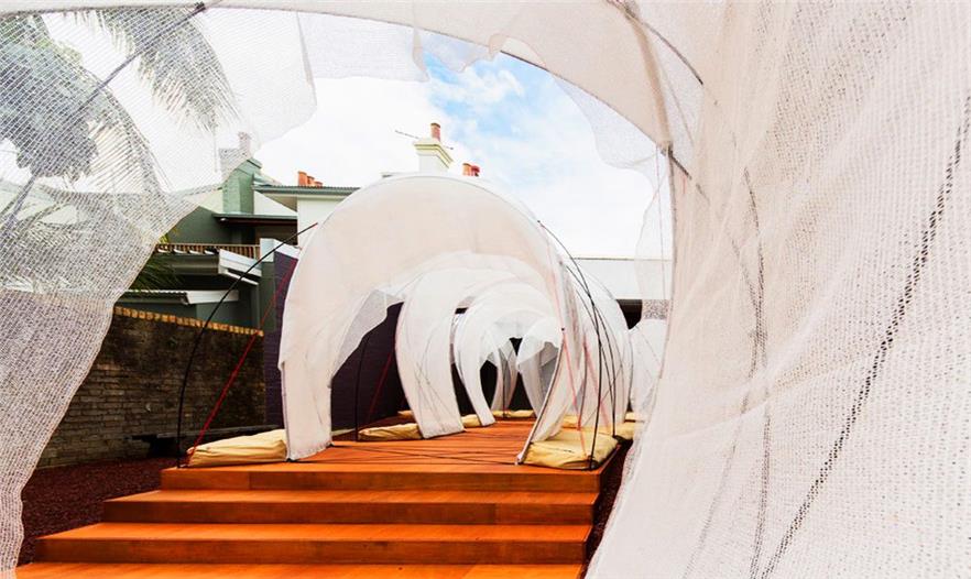 該項目被命名為Sway,是一個臨時性的景觀,它是由來自以色列的Tel Aviv市的sack和eicher + muller團隊完成的,在這過程中還離不開面料專家Eyal Zur的幫助。據(jù)悉,該項目已經(jīng)是該地區(qū)的第三次修整了,而且都是為了在該地區(qū)建立一個靈活多變的裝置?,F(xiàn)在正在進行中的項目建設便是受澳大利亞Sherman當代藝術基金會(簡稱SCAF)的委托,十分注重裝置的環(huán)保性。該設計實際上便是一個生態(tài)裝置,它是從以色列國家內(nèi)系統(tǒng)性的景觀體系中得到的靈感。盡管該地區(qū)干旱少雨,但此獨特的設計方式使得水果,蔬菜以及其他植物的生長成為可能。該項目位于謝爾曼當代藝術基金會的禪宗花園內(nèi),它的外觀設計似乎與當?shù)氐淖∨锕?jié)有著一定的關系,該節(jié)日是以色列人們紀念祖先曾在荒地求生,希望早日回到自己的希望之鄉(xiāng)的日子。該裝置并不是永久性的裝置,設計團隊在該項目中加入了很多的現(xiàn)代化元素,再加上高科技材料的應用和建造,這些帳篷看起來與游牧民族的貝都因人帳篷沒什么兩樣。