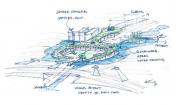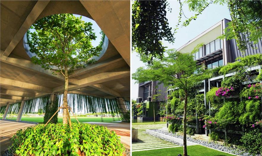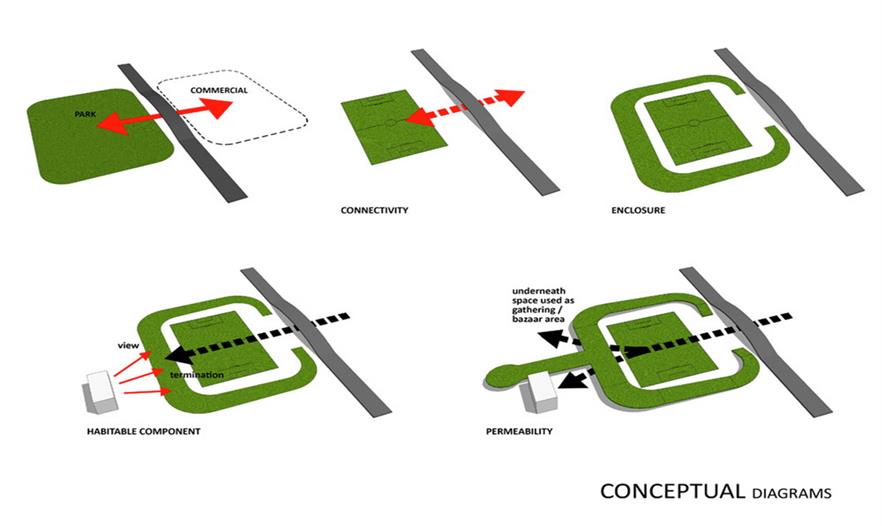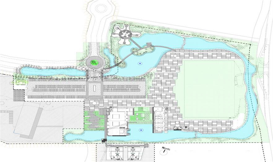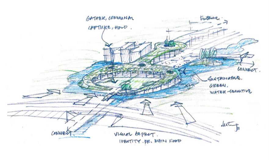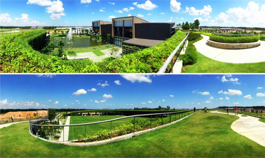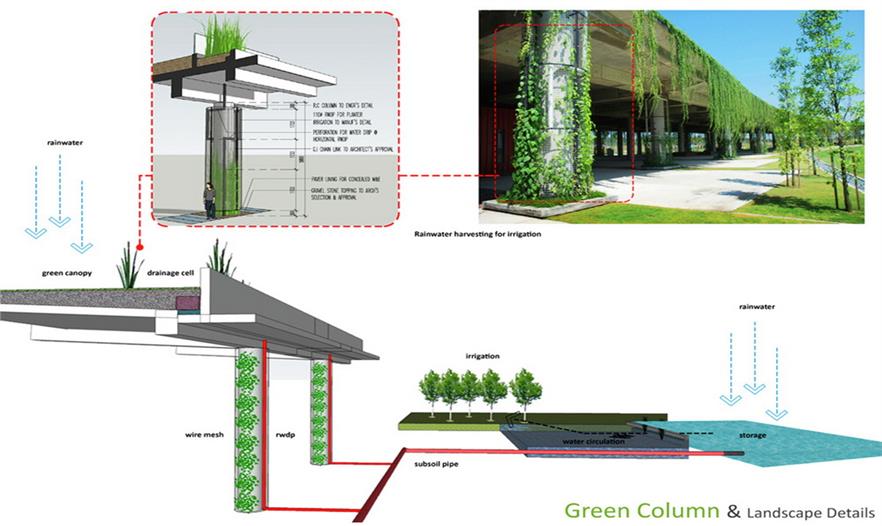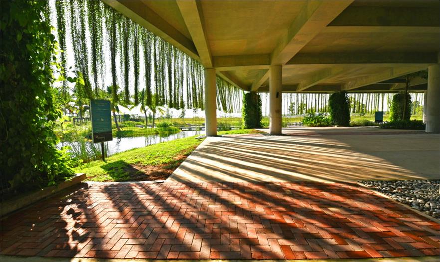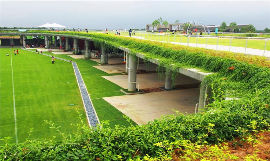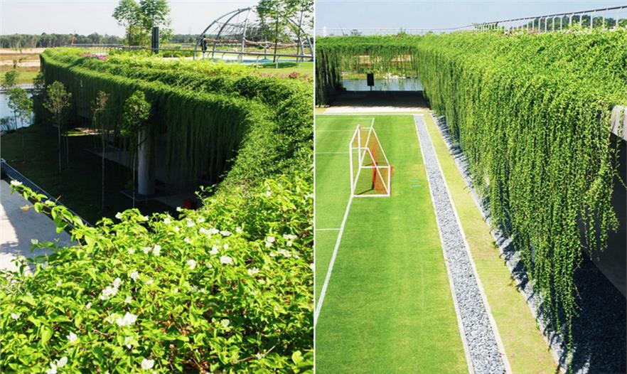 人類營(yíng)造場(chǎng)所的行為本質(zhì)上是驅(qū)動(dòng)設(shè)計(jì)概念的基本原則。人類希望生活在美好的景觀中是創(chuàng)造一個(gè)可辨認(rèn)的地方的根本動(dòng)力。集體社會(huì)活動(dòng)圍繞著與社區(qū)相關(guān)的公共空間展開(kāi)。傳統(tǒng)上,這種形式出現(xiàn)在最簡(jiǎn)單的地方:街道、路口、院落,以及在城市廣場(chǎng)、公園、大廳、體育場(chǎng)等更為復(fù)雜的城市形態(tài)中。這個(gè)圓弧的靈感就是基于這種基本意圖。在最基本的層面上,它提供了社區(qū)活動(dòng)的庇護(hù)所——生活、社交、娛樂(lè)、公共和運(yùn)動(dòng)活動(dòng)。同時(shí),它需要對(duì)環(huán)境作出反應(yīng),特別是在解決熱帶氣候的陽(yáng)光、熱、濕度和雨的問(wèn)題上。相應(yīng)的,它覆蓋走道的高和寬也為社區(qū)活動(dòng)提供了庇護(hù)。屋頂以一種可持續(xù)的方法維持了其自身和下方空間的涼爽:用土壤和綠化來(lái)隔熱。這樣做時(shí),它用一個(gè)升高的新生態(tài)系統(tǒng)有效地“取代”了地面綠化,不僅提供了開(kāi)放的娛樂(lè)空間,還提供了更高的制高點(diǎn)。緩緩升起的屋頂結(jié)構(gòu)和綠色屋頂露臺(tái)被認(rèn)為是人類原始本性的表達(dá),并通過(guò)對(duì)一個(gè)社區(qū)的標(biāo)記,在最基本的形式中,有效地進(jìn)行一個(gè)標(biāo)志性的行為,來(lái)表達(dá)人類對(duì)景觀改造的原始本性。這是設(shè)計(jì)概念所采用的基本原則。