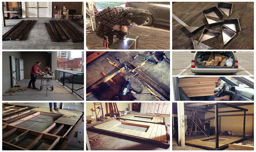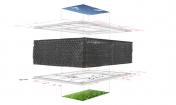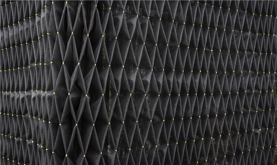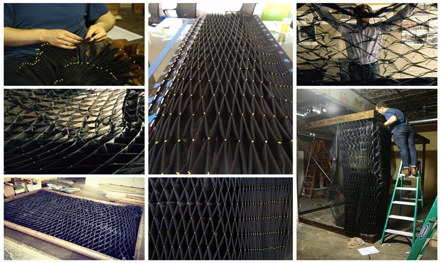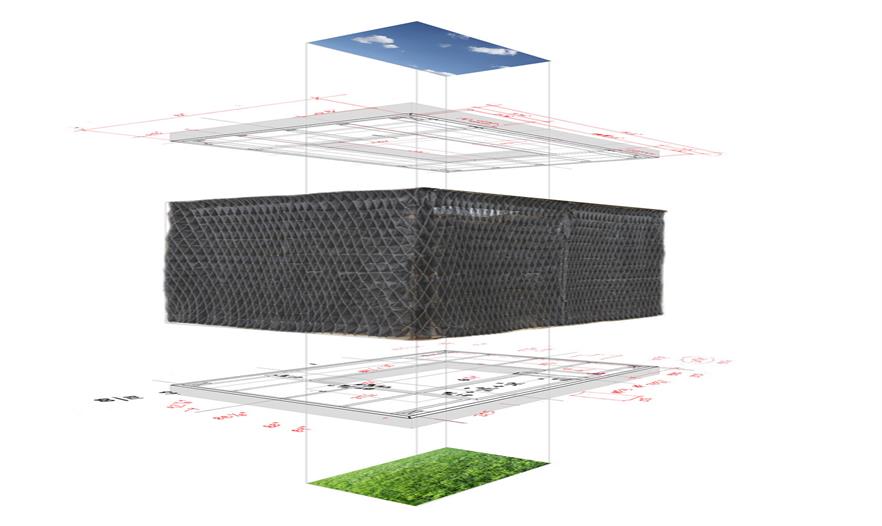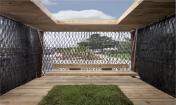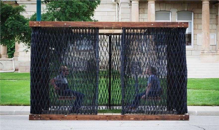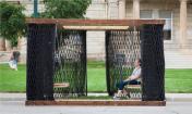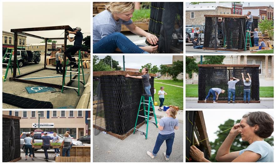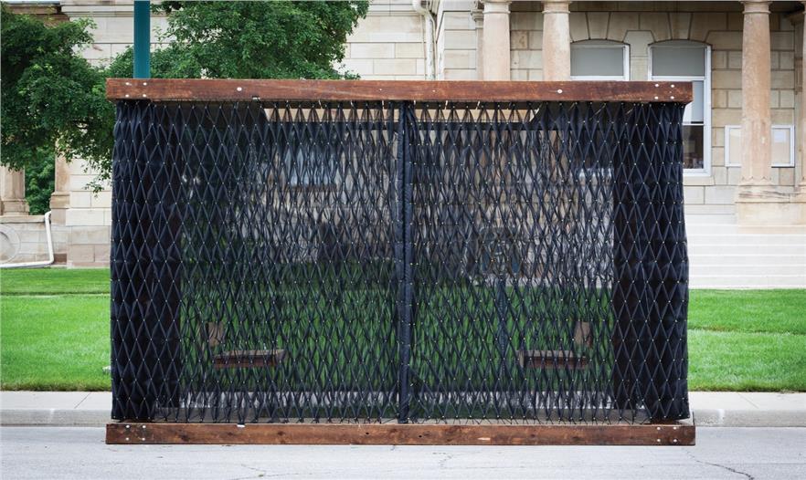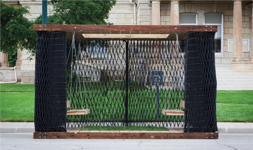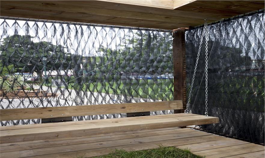 這個(gè)小型的手工制作建造的空間被認(rèn)為是一個(gè)可調(diào)配罩衫門廊??烧{(diào)配是因?yàn)樗谱魍瓿珊笞銐蛐。阌谝苿?dòng)。罩衫包裹,是因?yàn)椴捎么汤C技術(shù)去形成褶皺和縫制外層窗紗。門廊,指的是由內(nèi)而外的原始空間。一個(gè)簡單的木制框架明確了狹小的空間并支撐懸掛在兩個(gè)門廊的秋千。這個(gè)如同罩衫的網(wǎng)紗形成了一個(gè)可以打開和關(guān)閉的窗簾,也提供遮陽和封閉空間。在屋頂上的矩形開口也同時(shí)允許清晰明媚的日光進(jìn)入。這個(gè)小開口形成的光斑區(qū)域在地板切入的小型草地區(qū)域不斷回蕩。這個(gè)的設(shè)計(jì)和建設(shè)毗鄰美國愛荷華州Winterset的法院廣場,無償支持愛荷華州建造聯(lián)盟( The Iowa Preservation Alliance)。木材取自從一個(gè)拆遷房屋,設(shè)計(jì)團(tuán)隊(duì)縫制、建造和建設(shè)。這個(gè)項(xiàng)目的最終的預(yù)算是900美金(網(wǎng)紗材質(zhì),緊固件和交叉支撐)。