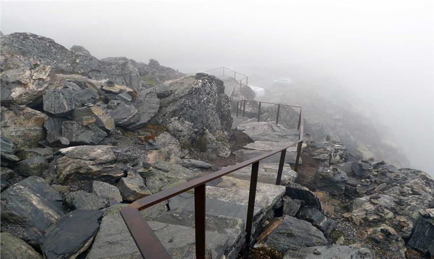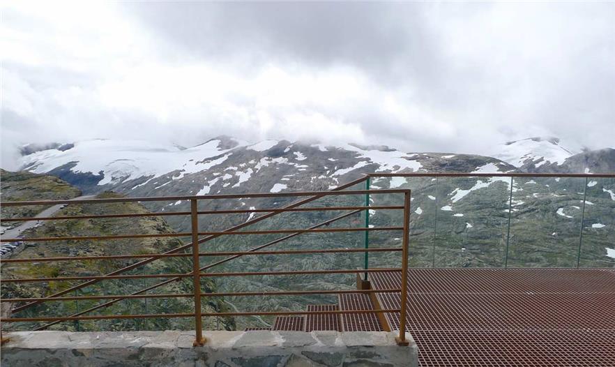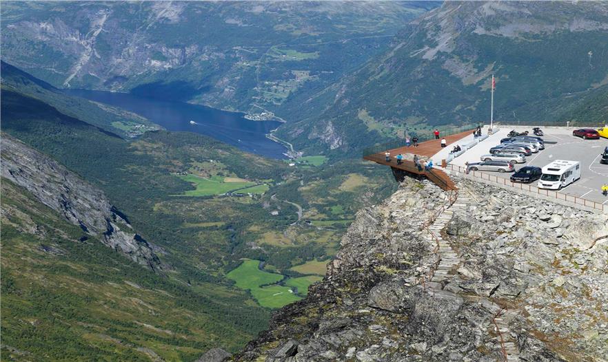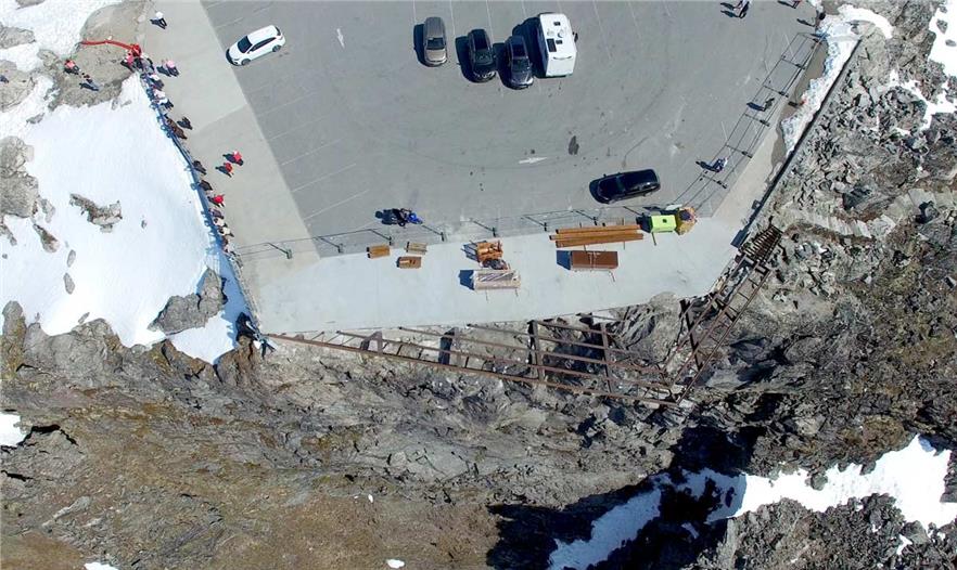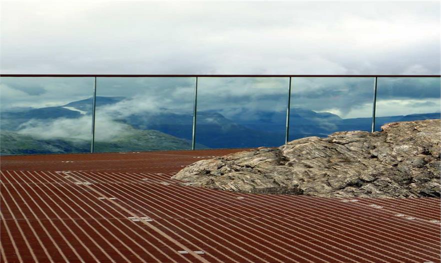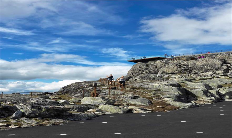 這個新停車空間巧妙地設(shè)在石頭之間,建在當(dāng)?shù)厥^墻上,能直接到達(dá)修復(fù)的通道。這條通道基于舊路路線建造,蜿蜒地到達(dá)頂部。欄桿這樣設(shè)計就會凸顯這條通道,引起人們的興趣。這個平臺離地面約500米,能看到下面壯觀的Geiranger景色和峽灣景象,看到遠(yuǎn)方的山脈和Bl?breen冰川。