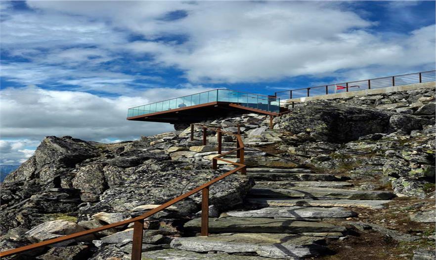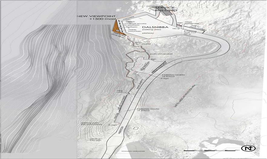 Dalsnibba是位于挪威默勒-魯姆斯達(dá)爾郡的一座山,海拔約1500米。它位于Geiranger山谷的末端,在Geiranger村莊南21千米處,Geirangerfjorden是其景色亮點(diǎn)。這些年來,到夏季,汽車都能到達(dá)Dalsnibba頂部,看到峽灣壯觀的景象。游客數(shù)量也在不斷增加,這就需要擴(kuò)張停車設(shè)備,修復(fù)到達(dá)頂部的舊路,建造一個更加壯觀的觀景臺。所有的設(shè)計都受到Dalsnibba現(xiàn)有的保護(hù)需求以及周圍景觀的限制。這塊地形很陡峭,不可能走到老舊的平臺外面。該項(xiàng)目重點(diǎn)強(qiáng)調(diào)尋求現(xiàn)有景觀質(zhì)量、被遺棄的道路和在該區(qū)域保護(hù)需求內(nèi)實(shí)施之間的平衡。保護(hù)自然表面和脆弱的北極植被、建筑與山體結(jié)構(gòu)之間的相互作用很重要。其顏色規(guī)劃很好地映襯了周圍的環(huán)境。