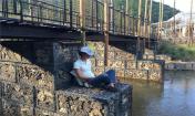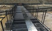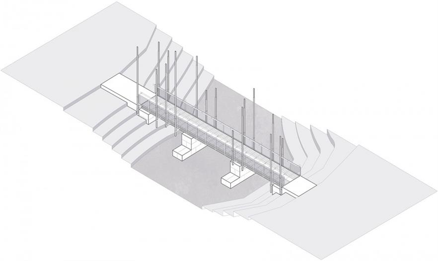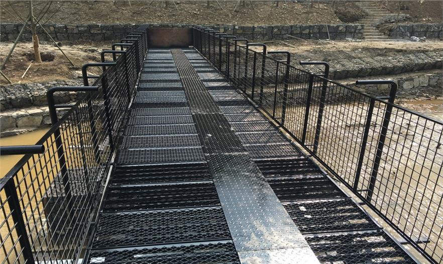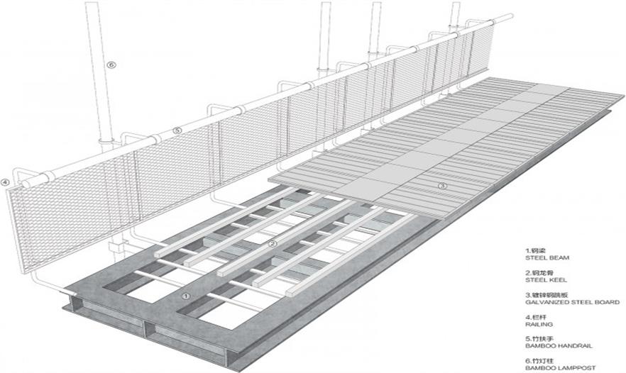三跨的人行橋的橋面為鋼結(jié)構(gòu),總共三段,每段分開(kāi)焊接制作,通過(guò)螺栓連接。電焊工是在中國(guó)任何城鄉(xiāng)都可以找到的成熟技術(shù)工種。易于購(gòu)買的規(guī)格鋼材和成熟的制作技術(shù)使橋面可以在現(xiàn)場(chǎng)短時(shí)間加工完成。作為人行橋,我們希望過(guò)橋的同時(shí)能夠有豐富的體驗(yàn),選取一種可以看到河水的的通透材料作為橋面材料,在經(jīng)過(guò)多番選擇比較后,最后選定使用鋼跳板作為橋面,用于腳手架的鋼跳板是一種被廣泛應(yīng)用的成品材料。跳板經(jīng)過(guò)整體鍍鋅后極為耐腐耐壓,作為橋梁使用和磨損程度最高的橋面來(lái)說(shuō)最合適不過(guò),而且鋼跳板面層為高強(qiáng)度的鍍鋅鋼網(wǎng),滿足橋面的通透需求,行人可以透過(guò)橋面看到河水。為了方便女士,在橋面上還鋪設(shè)了一條60公分寬的鋼板帶,女士過(guò)橋也不必?fù)?dān)心高跟鞋被卡住的問(wèn)題。