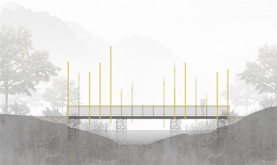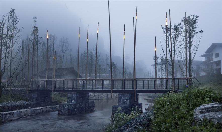 橋身和橋面充滿工業(yè)感的冷峻鋼材難免少了一絲親切,為了與環(huán)境形成良好呼應(yīng),燈桿和扶手秉承就地取材的原則,選用道地的鄉(xiāng)間材料——竹子,內(nèi)部通體打穿并埋入照明線路。高高聳立的燈桿與河中綿延的蘆葦蕩遙相呼應(yīng),讓橋與自然融為一體。夜幕降臨后亮起的竹燈桿,仿佛在寂靜山野中點(diǎn)亮的盞盞蠟燭,為山村平添一筆詩(shī)意。