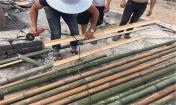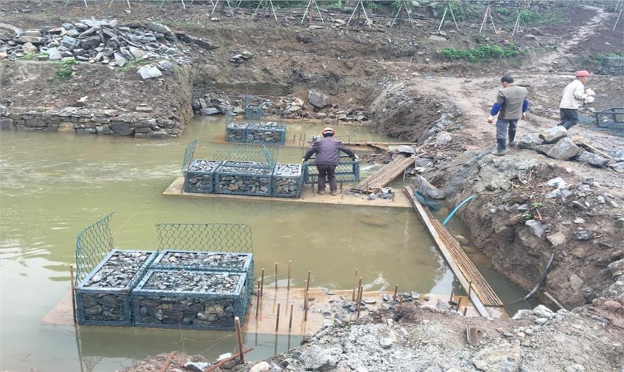 村落地理位置偏僻,作為主要施工人員的村民們掌握的技術(shù)十分簡(jiǎn)陋,這也限制了設(shè)計(jì)的復(fù)雜程度。為了保證在下一個(gè)雨季前能夠完成施工,讓村民正常通行,建設(shè)周期須盡可能的縮短,各種條件導(dǎo)致高技術(shù)含量的橋梁施工在此很難實(shí)現(xiàn)。因此,需要借助一種簡(jiǎn)便且穩(wěn)定的材料及施工方式,我們選用了在水利工程里常見(jiàn)的石籠網(wǎng)箱工藝,經(jīng)過(guò)特殊處理的高強(qiáng)度鍍鋅鋼絲經(jīng)過(guò)PVC防腐包覆加工后編織成網(wǎng)箱,裝填石料后經(jīng)過(guò)綁扎即成石籠網(wǎng)箱,其特有的柔性結(jié)構(gòu)使之既牢固穩(wěn)定耐沖刷,而且可以抵御一定程度的沉降和形變,施工簡(jiǎn)便,造價(jià)低廉,無(wú)需機(jī)械,非常適合在山區(qū)等技術(shù)設(shè)備受限的場(chǎng)地施工。為保證足夠的橋墩重力并減小迎水面所受的沖擊,橋墩采用船體形式,面寬1m,順?biāo)v深4m。放置網(wǎng)箱前預(yù)先平整河床,澆筑混凝土基礎(chǔ)。