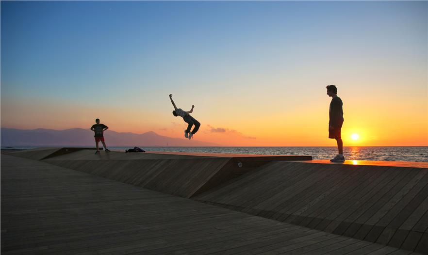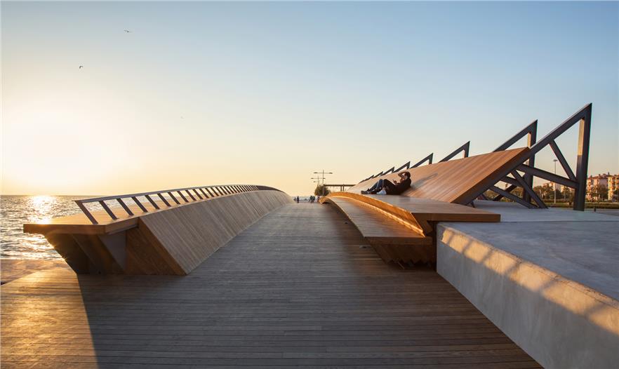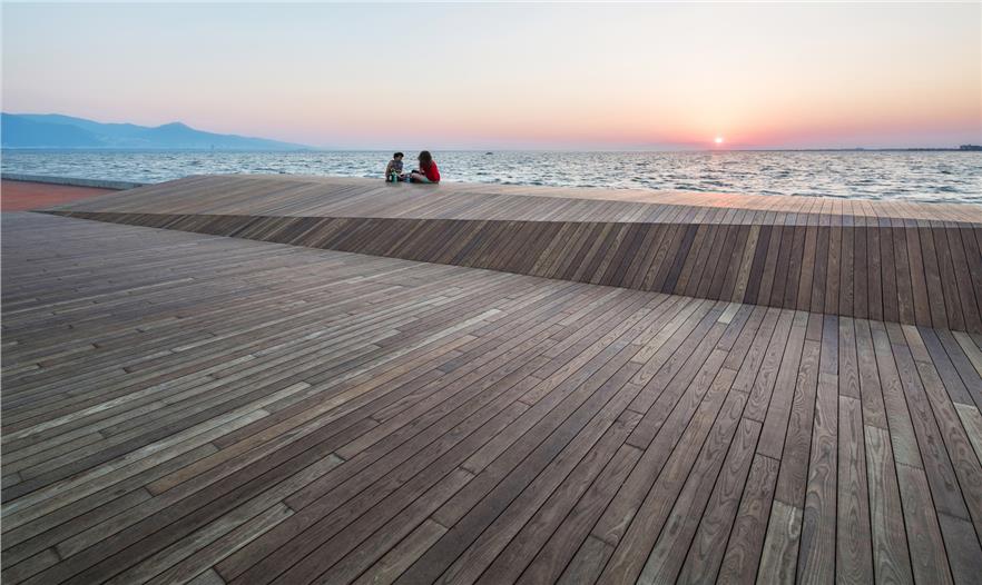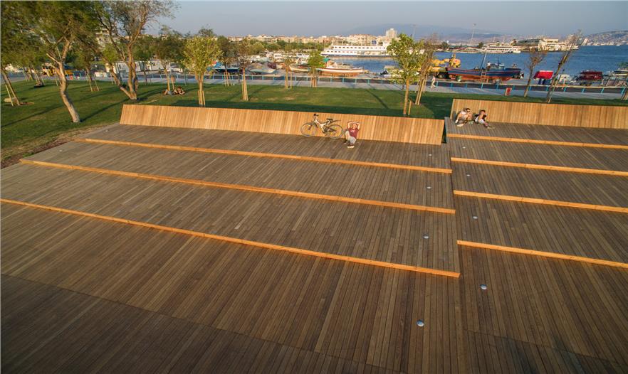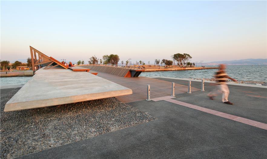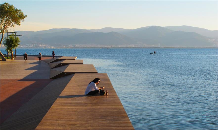 Bostanl? 陽(yáng)光房坐落在Kar??yaka面向西側(cè)的海岸之一,由層疊的木飾面包裹形成了一個(gè)敞開的城市立面,延伸在綠化的人造斜坡和路堤之中。表面簡(jiǎn)潔流暢的線條鼓勵(lì)游客更加接近陽(yáng)光和大海。 與人行橋一樣,這種木飾面覆蓋的表面還有著親和的觸感,主要由于材料的自然紋理。陽(yáng)光房使?zmir的人們重拾了已經(jīng)遺失的展現(xiàn)城市記憶的儀式——每天傍晚共同欣賞海岸線,度過(guò)美好的時(shí)光。