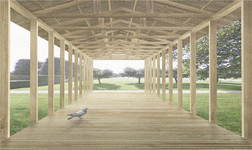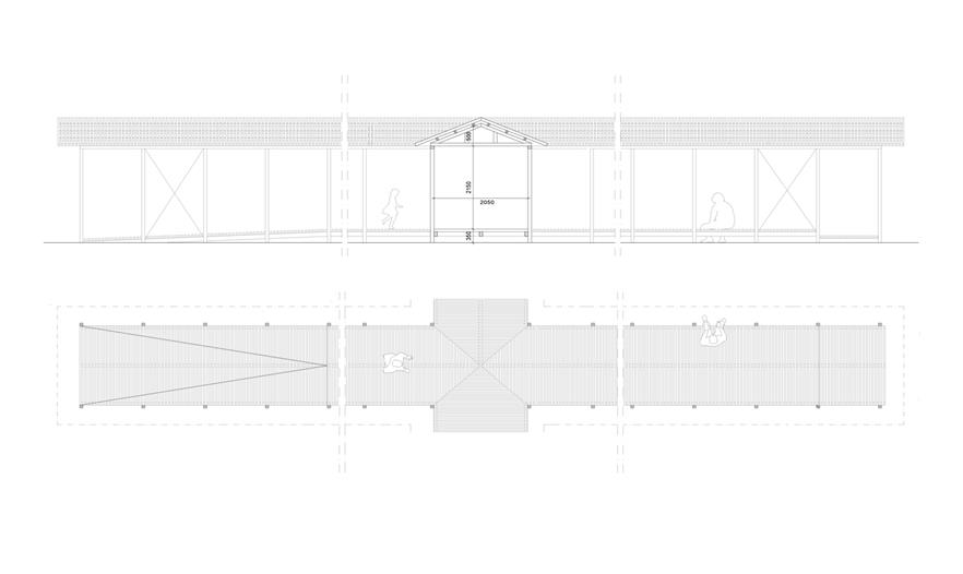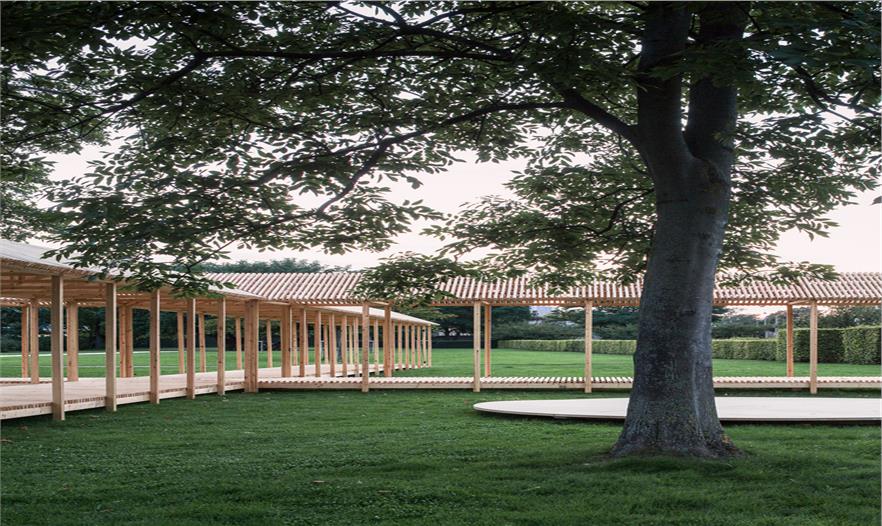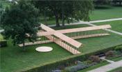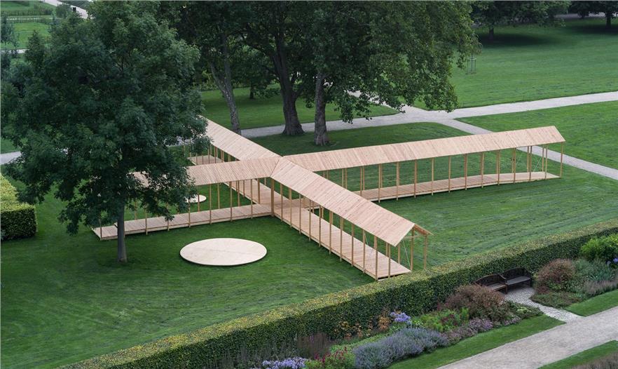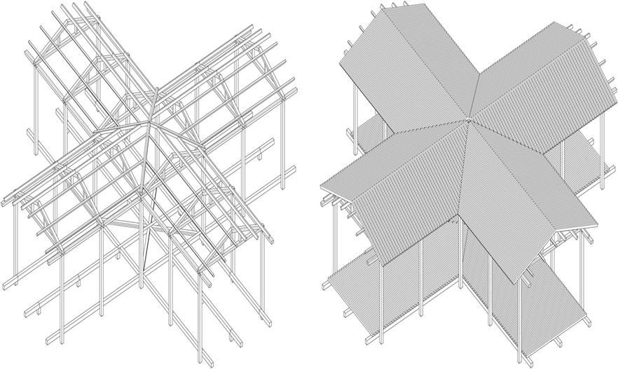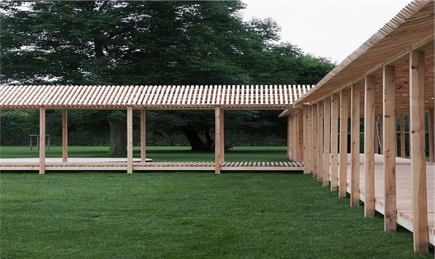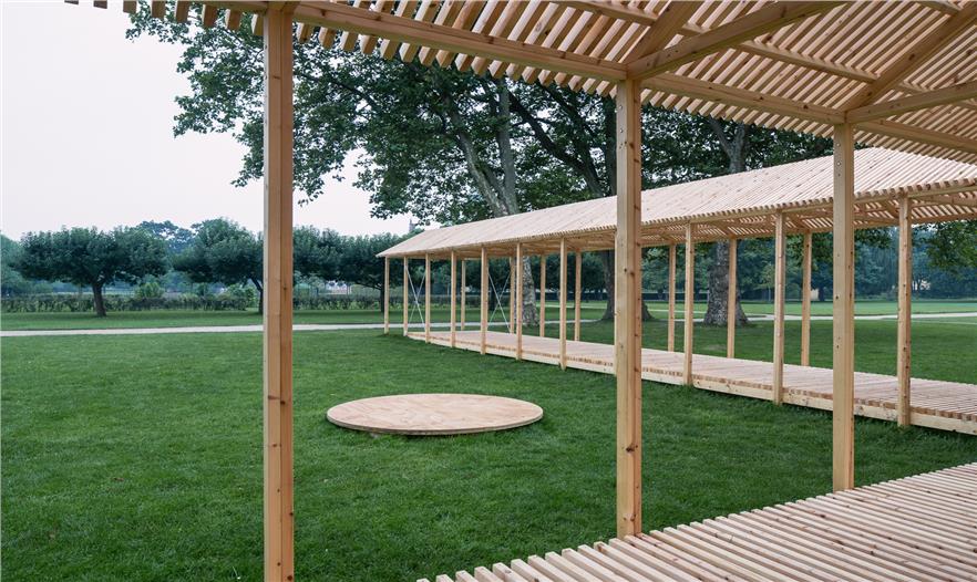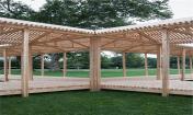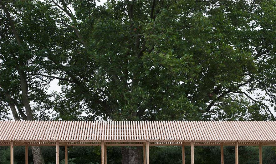 從平面看,園亭是一個(gè)十字形,每一個(gè)被風(fēng)格化的短邊開口邀請(qǐng)著大家去里面散散步。在亭子里散步的過程中,整齊有節(jié)奏的方柱擺列形式會(huì)讓人回想起在花園里成依次排開的大樹。而透過屋頂結(jié)構(gòu)之間的縫隙的光線如同樹的皇冠一般耀眼。