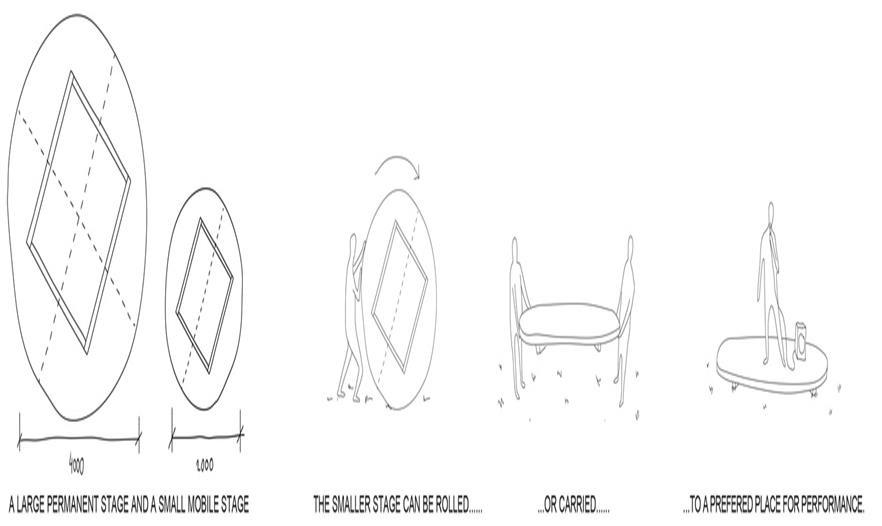 在大舞臺(tái)旁增設(shè)的移動(dòng)小平臺(tái)是為了實(shí)現(xiàn)根據(jù)不同的喜好和需求可以安排到不同的地方去。演出可以同時(shí)在兩個(gè)舞臺(tái)上進(jìn)行,而園亭也可以變成一個(gè)舞臺(tái)。不同尺度的舞臺(tái)將創(chuàng)造各種音樂會(huì),戲劇表演和其他藝術(shù)形式表達(dá)的可能性。園亭還可以舉辦其他活動(dòng),例如長(zhǎng)桌聚餐,時(shí)裝表演和展覽。