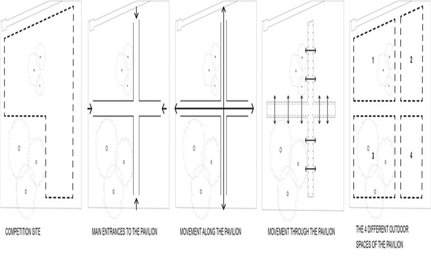 園亭呈開放的狀態(tài),可以從任意角度進(jìn)入,不分正面反面。在園亭的側(cè)邊提供了給人們休息的地方,交叉式的園亭提供了可以與另外四個(gè)小型室外空間作互動(dòng)的機(jī)會(huì)。而這些室外空間各有各的特色與個(gè)性。