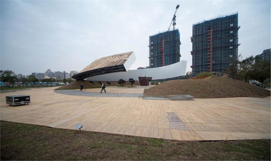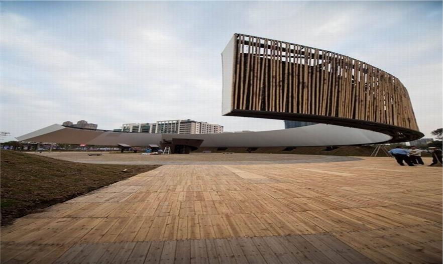 《環(huán)》的造型以新竹古稱「竹塹」反應(yīng)地域文化的特色,除了以可重復(fù)使用的鋼結(jié)構(gòu)為主體外,外環(huán)立面以代表當(dāng)?shù)靥厣闹褡幼鰹椴牧希瑑?nèi)環(huán)以回收材料制成的投影布幕,鋪面以竹筒作為透水性地坪,充分表現(xiàn)本土特色、環(huán)保建材,并降低運輸所消耗的能源。