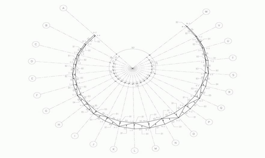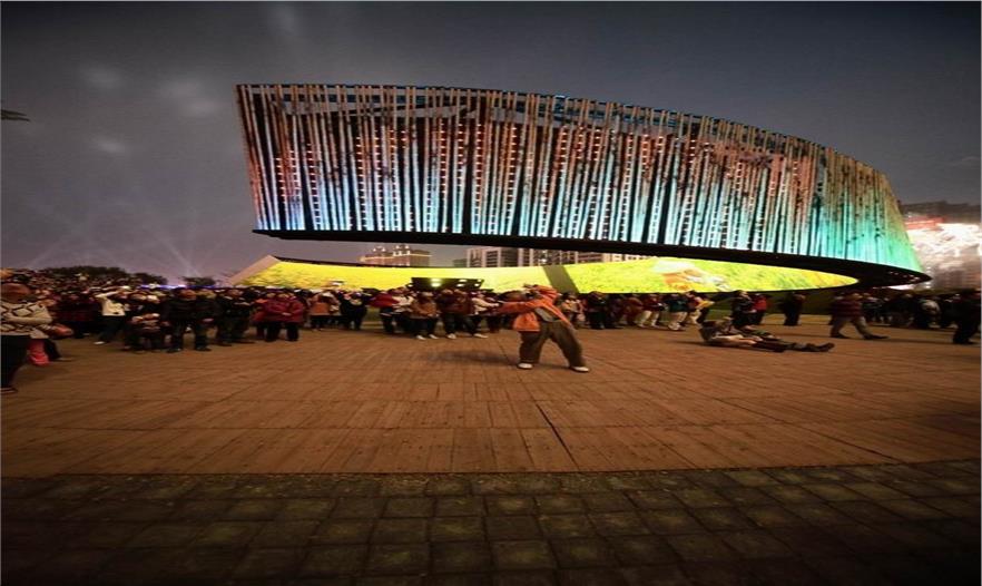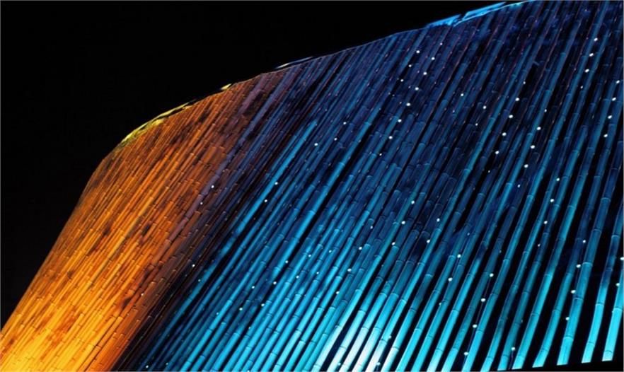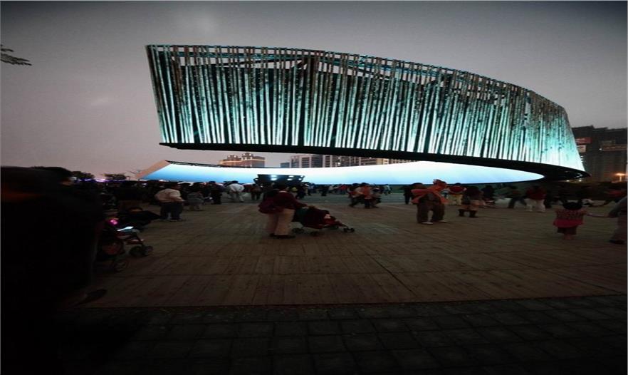 建筑師事務(wù)所設(shè)計,以可重復(fù)使用的鋼構(gòu)為主體,外層覆竹,架構(gòu)長達七十米的巨環(huán)。燈體內(nèi)層以臺達高流明投