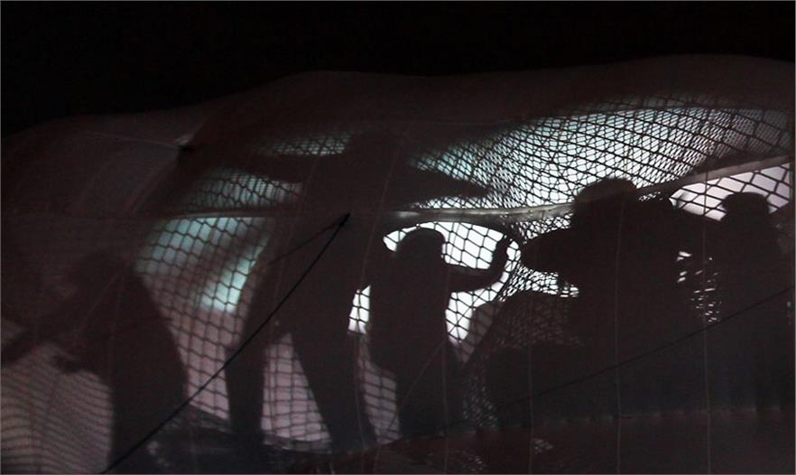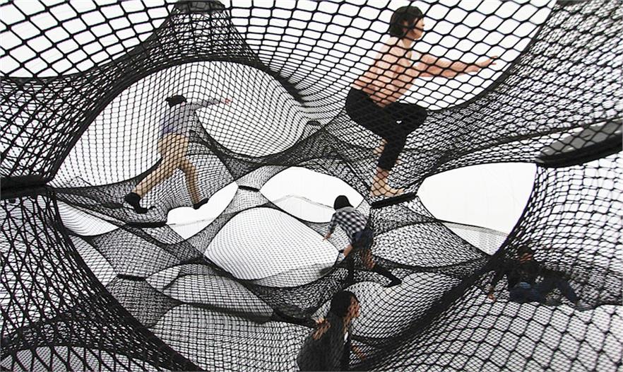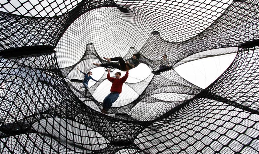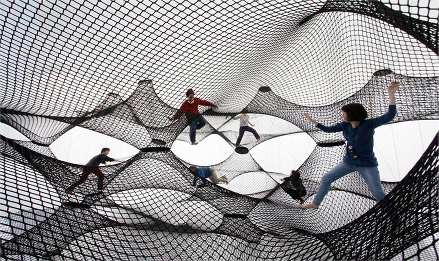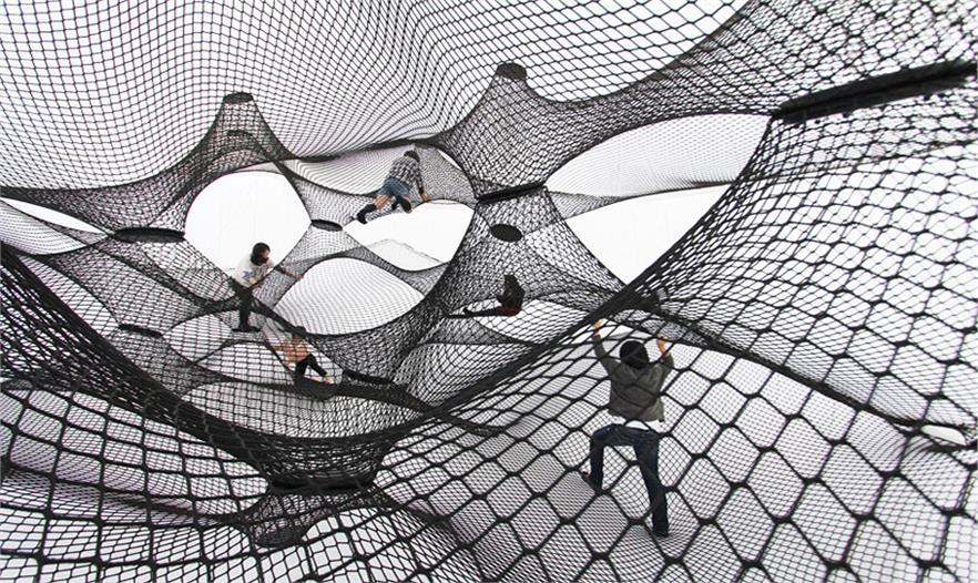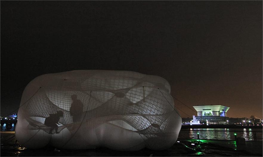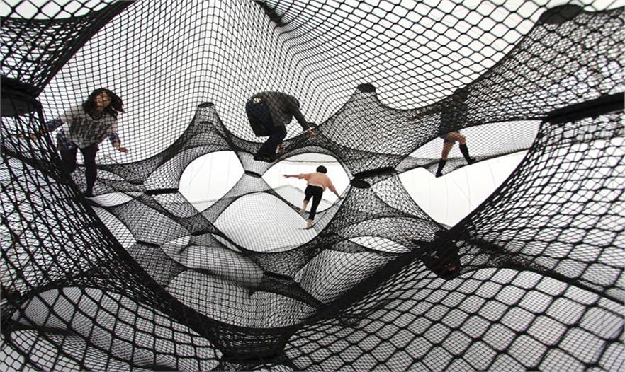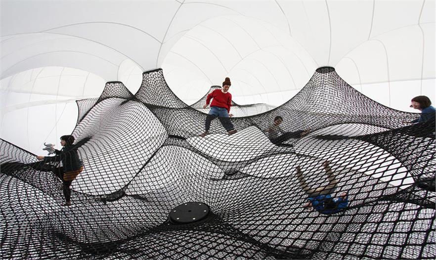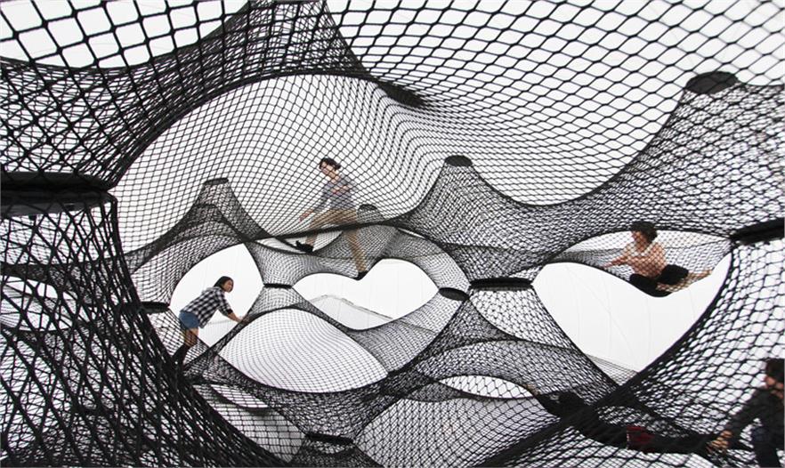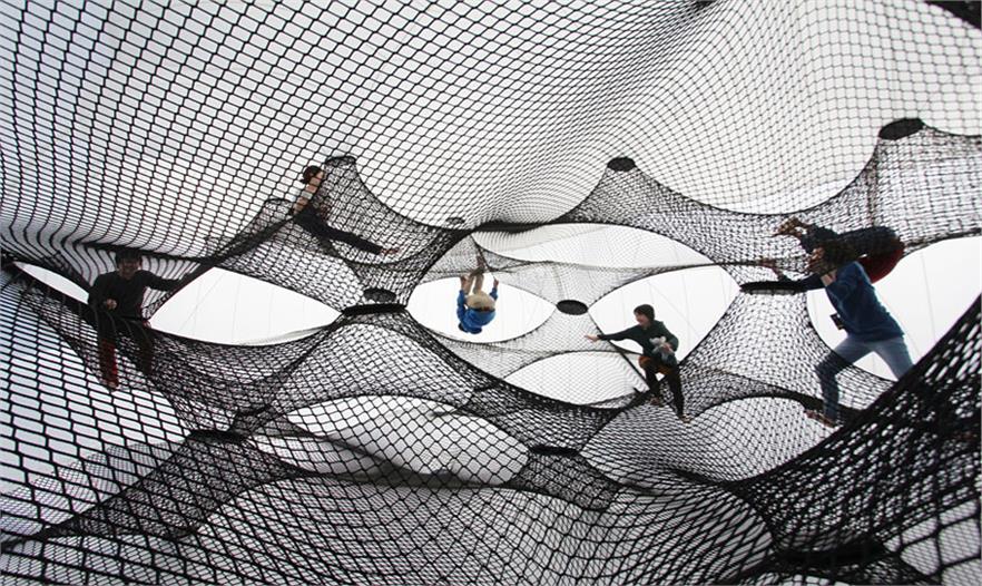 Numen在日本橫濱創(chuàng)造了這樣一個“互動式的充氣空間”,整個造型如同一個白色的泡泡,通過充氣后的內(nèi)部張力來進行支撐,內(nèi)部是有一系列的黑色網(wǎng)狀材料交織而成,他又是一個互動式的球狀玩??臻g,參觀者可以進入里面,在黑色網(wǎng)狀物之間爬來爬去,到了晚上,里面的任何動作在外面都一清二楚,如同上演一場皮影戲。