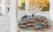 “花墊”從地面升騰而起,仿佛崔正化設(shè)計的鮮花雕塑絢爛綻放。小山型的設(shè)計遵循了現(xiàn)有人行道的棋盤式圖案和顏色,由常見的環(huán)環(huán)相扣的水泥鋪路磚制作而成。這些“花墊”呈向心狀的橢圓形環(huán)繞鮮花雕塑,平面長度為10m,寬7m,高1.2m。