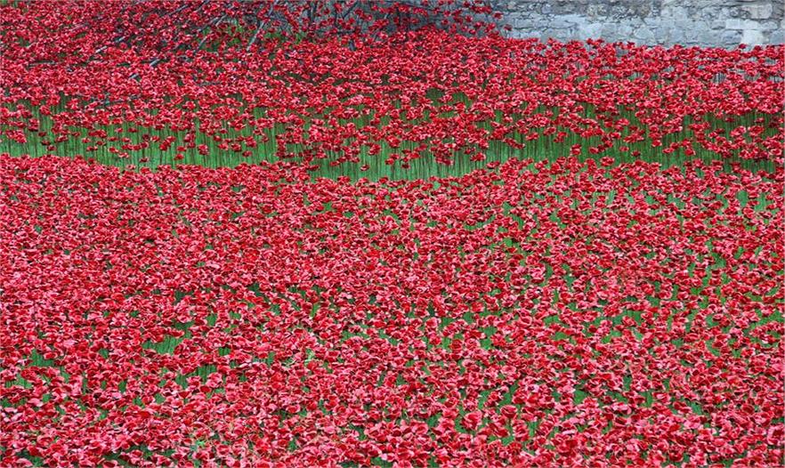 每年的11月11日是英國的戰(zhàn)爭紀念日,為了紀念一戰(zhàn)結束以及在一戰(zhàn)中犧牲的英國聯(lián)邦軍隊的戰(zhàn)士們。藝術家Paul Cummins和舞臺設計師Tom Piper將象征著犧牲和貢獻的888246朵陶瓷罌粟布置在倫敦塔外干涸的護城河上?;ǘ湎駨囊粋€窗戶中爭先恐后的涌出,瞬間覆蓋了這片將歷史遺跡和城市中心分隔開來的寬闊綠地。從8月開始,這片“血色彌漫的土地”就開始循序漸進地向外擴張。有超過8000名志愿者參與到這個項目,將深紅色的陶瓷罌粟一朵一朵的布置在場地中,每一朵花都代表了一個在戰(zhàn)爭中犧牲的英勇的聯(lián)邦士兵。直到紀念日的前一天,所有的罌粟才完全布置完成,設計師們通過強大的設備和震撼人心的視覺紀念效果來反映對紀念日的重視和尊重。