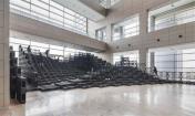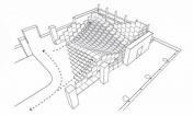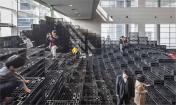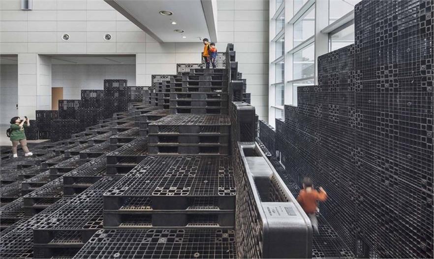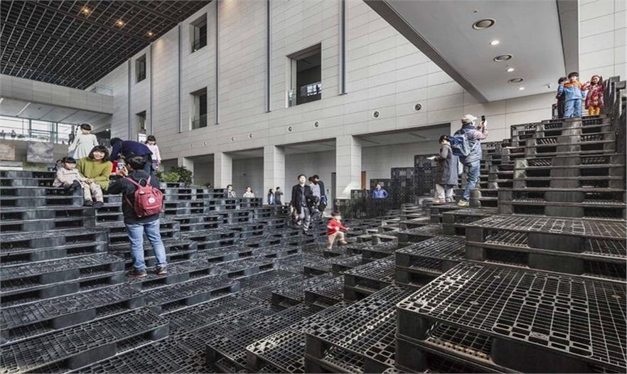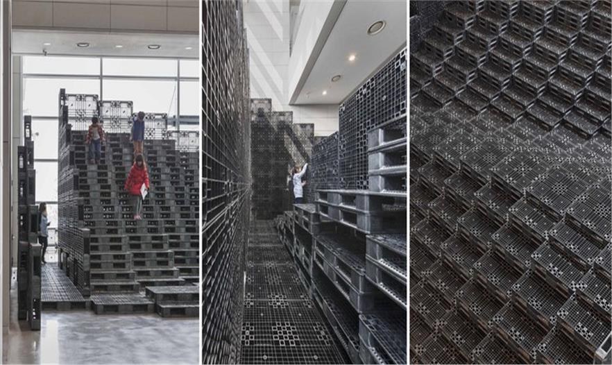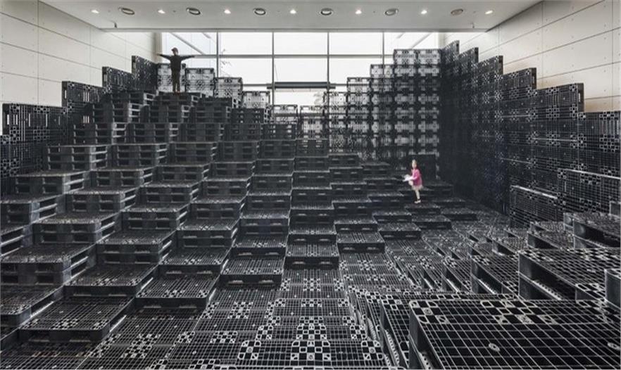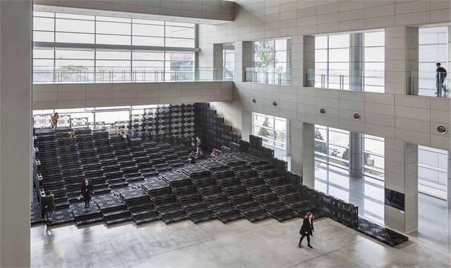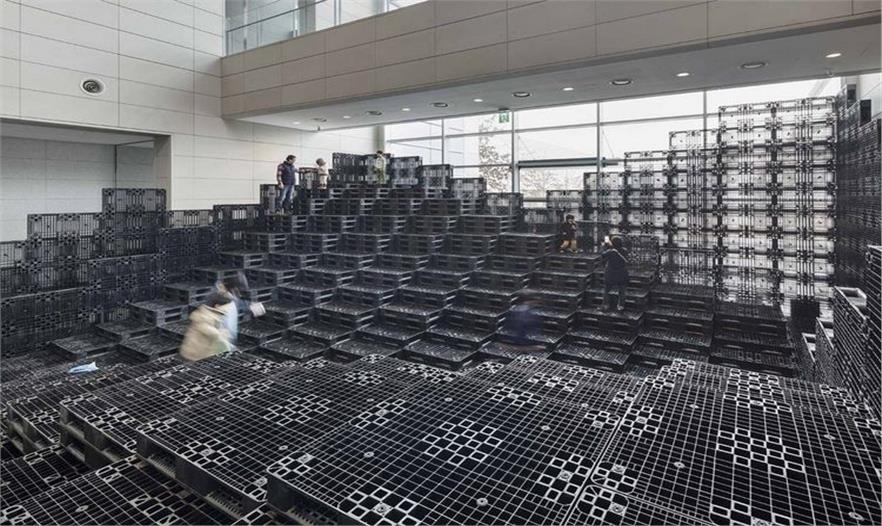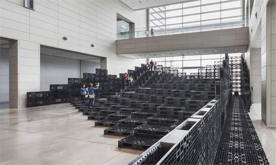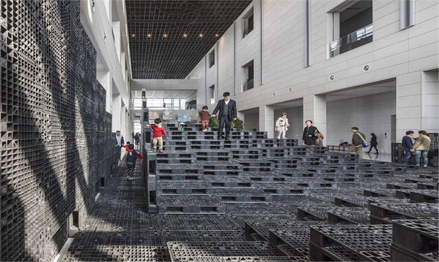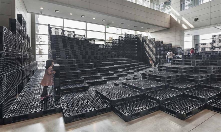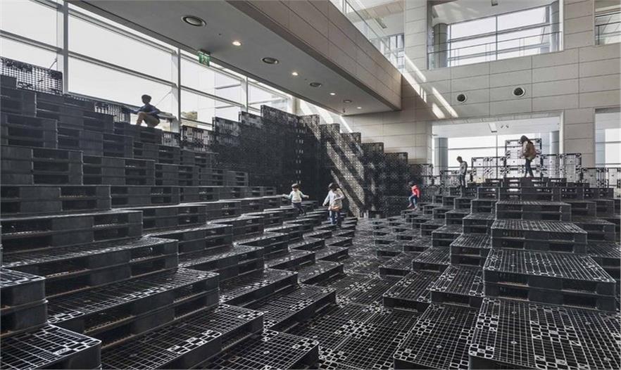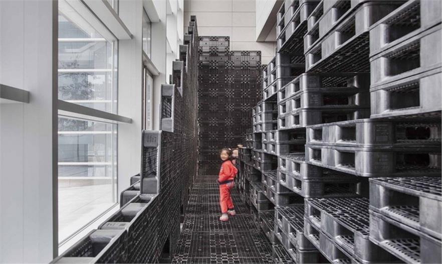 1000塊循環(huán)利用的塑膠棧板工業(yè)材料被集中起來應(yīng)用到詩意空間中,依據(jù)功能、空間和結(jié)構(gòu)用途采用不同的裝配邏輯。三層的棧板使豎立最高5m的分隔墻成為可能。垂直和水平層的整體結(jié)合按照C字型的展覽空間邊緣折疊,引導(dǎo)游客視野和流線。