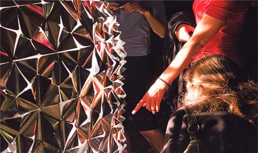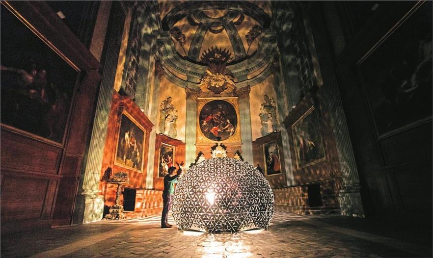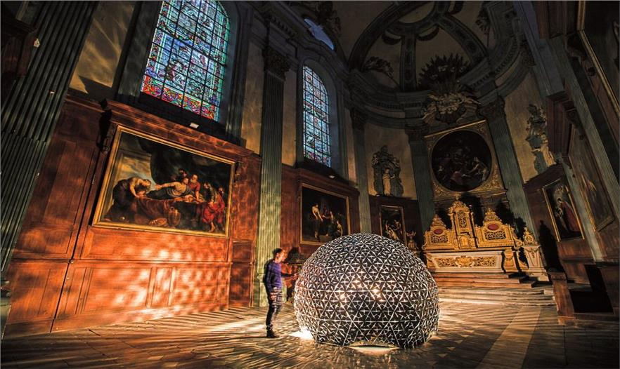 由新銳藝術(shù)師和建筑師丹·羅斯加德設(shè)計(jì)的交互藝術(shù)品“蓮花”在法國里爾的瑪?shù)律徑烫寐≈卣钩??!吧徎ā笔怯脭?shù)百塊超輕鋁合金花朵打造的圓形藝術(shù)品,能根據(jù)人們的行為張開閉合。當(dāng)有人靠近時(shí),巨大的銀色圓球瞬間亮起,綻放花朵?;ǘ涞膹埡想S著人們舒緩的氣息和鮮活的情緒而變化。燈光的強(qiáng)弱也發(fā)生相應(yīng)的變動,營造了唯美的光影互動效果。墻面上倒映的蓮花圖案和深沉的音樂將文藝復(fù)興的環(huán)境轉(zhuǎn)變?yōu)椤翱萍冀烫谩薄?br/>