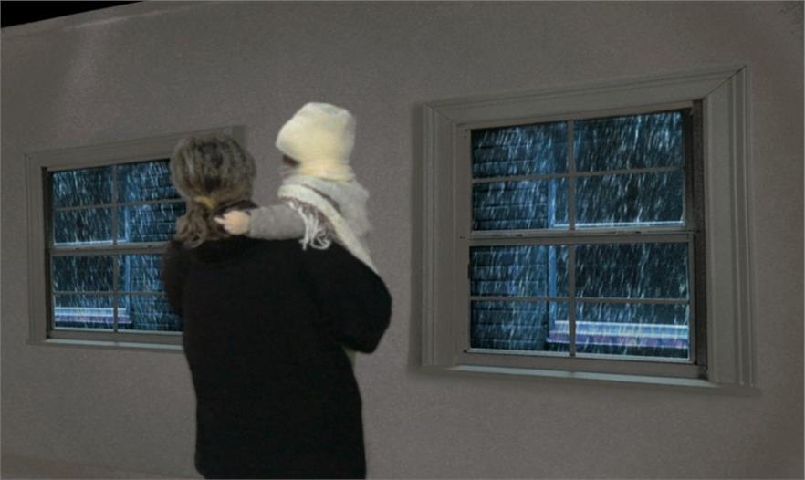 這是Leandro Erlich第一次展出的作品「Rain」,2000年的惠特尼雙年展。一個(gè)被隔成幾面墻的展廳,每個(gè)墻上分別都有3個(gè)窗口,墻和墻之間營(yíng)造出來的效果如兩幢貼得很近的建筑,建筑之間是一場(chǎng)傾盆大雨,包括轟轟的雷雨聲。仿佛觀眾透過窗口看到的就是真實(shí)生活中的雷雨。