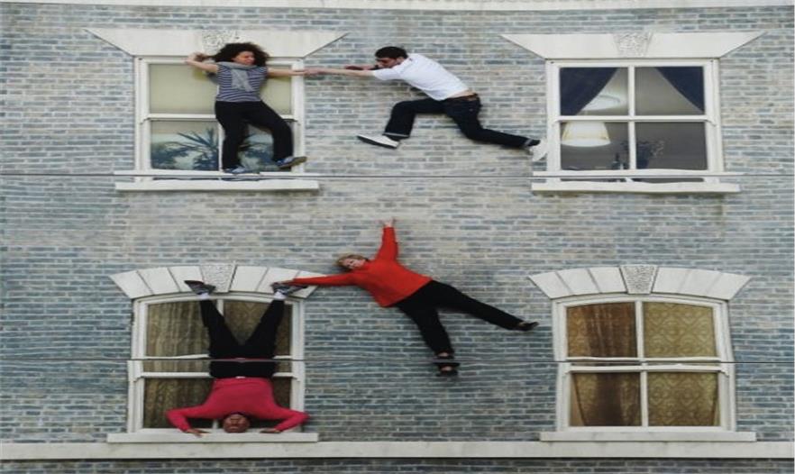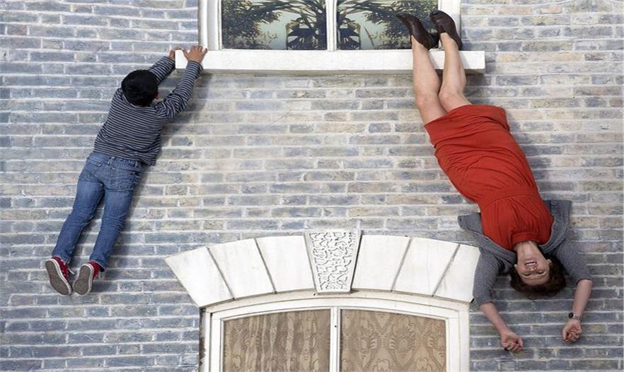 從圖片中看來,仿佛人真的能違反地心吸力,飛檐走壁?其實(shí)是鏡中倒影造成的錯(cuò)覺。