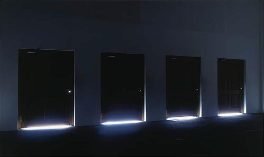 這是2004年第26屆圣保羅雙年展Leandro ERLICH的展出作品「門」(Las Puertas)。黑暗的空間內(nèi)放置著一排并列的門。門的下方安裝了明亮的日光燈,觀眾將誤以為門里面的空間是明亮的,其實(shí)門的另一方和空間一樣黑暗。