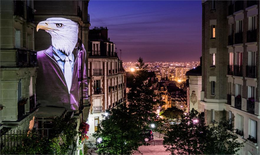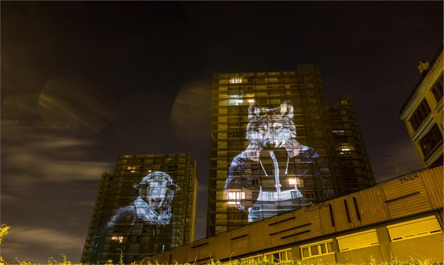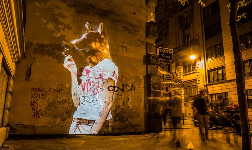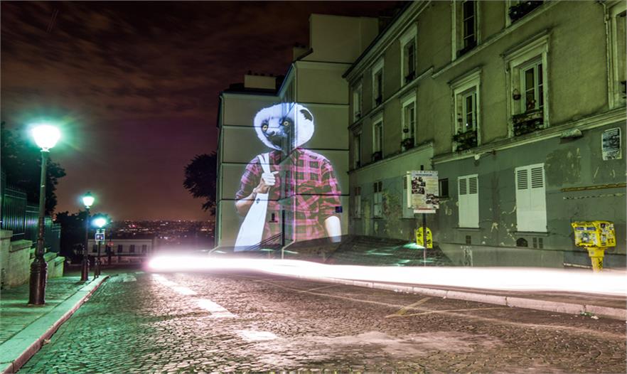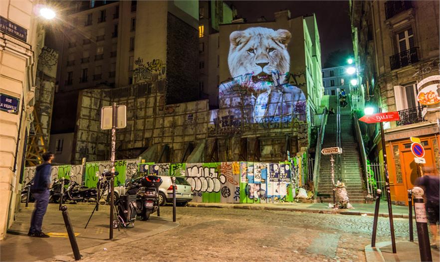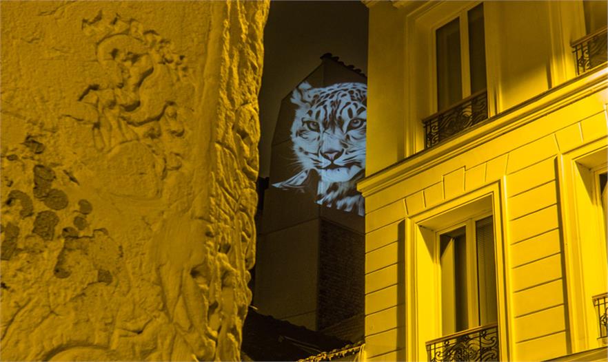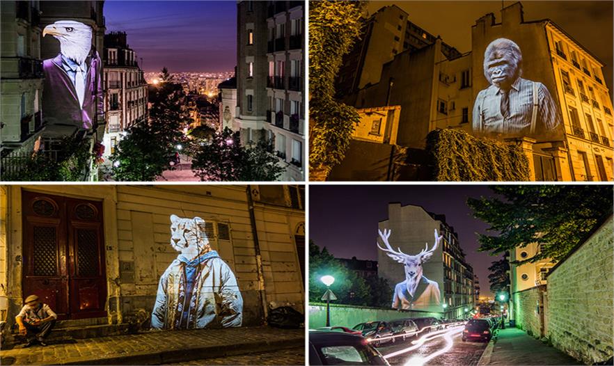 法國藝術(shù)家Julien Nonnen創(chuàng)造了“Safari Urbain”作品,是一組投射在巴黎建筑上時尚、擬人化的動物圖面。