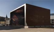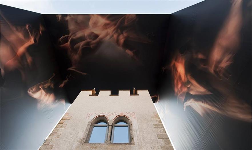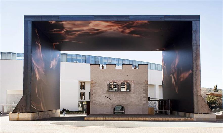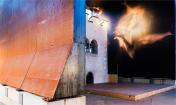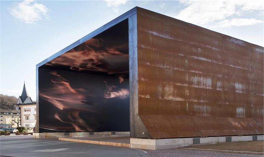 建筑師希特黑勒構(gòu)思出一個(gè)不朽的外部遮蓋構(gòu)筑物,通過“墻內(nèi)身體”的描繪性寫照將這座歷史悠久的火藥塔“罩”起來。巨大的底盤托起筆直的鋼板越過塔頂,形成一個(gè)門框的形狀,構(gòu)筑時(shí)選用的材料則是外表生銹的金屬材料,而構(gòu)筑物的內(nèi)表面則浮現(xiàn)著許多動(dòng)態(tài)繪畫作品。這是一件龐大的構(gòu)筑物,內(nèi)表面上所呈現(xiàn)的畫面是在一片漆黑無比的背景里一些穿著長(zhǎng)袍的人似乎在向前用力推著什么,從而在塔樓和裝置作品之間形成一種關(guān)聯(lián)。
