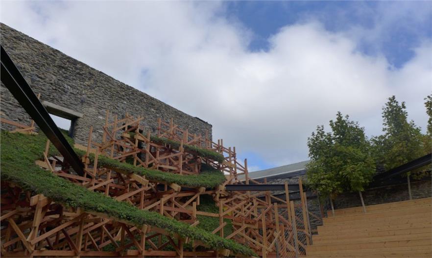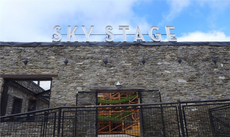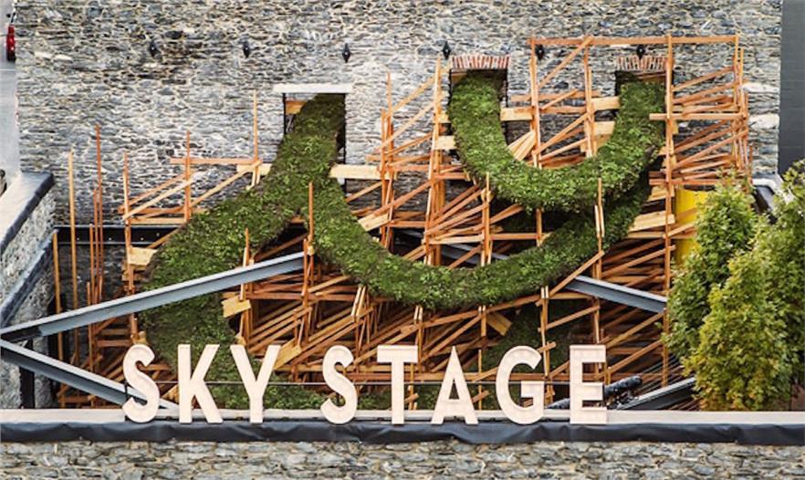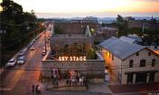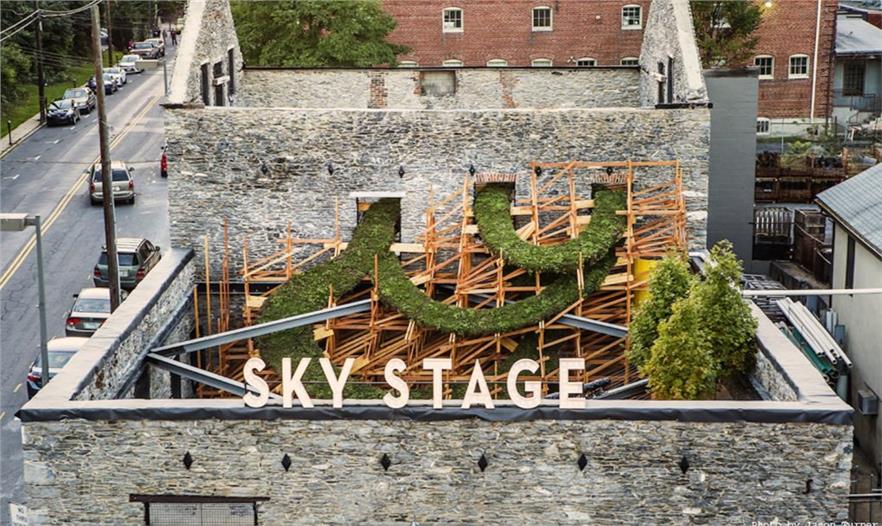Sky Stage藝術(shù)品位于弗雷德里克縣具有歷史意義的市區(qū),是一個(gè)臨時(shí)性藝術(shù)品,使用植物和計(jì)算機(jī)設(shè)計(jì)的結(jié)構(gòu)為這個(gè)被毀的建筑帶來生機(jī)。組織者移除了膠合板,之前擋住了進(jìn)入這個(gè)歷史性石頭建筑的公共通道,并沒有設(shè)置屋頂。藝術(shù)家希瑟?克拉克和麻省理工學(xué)院的電子結(jié)構(gòu)研究組使用計(jì)算機(jī)算法設(shè)計(jì)了一個(gè)2層高的木格子,成為蜿蜒彩虹的結(jié)構(gòu)基底,上面覆蓋著耐旱植物。建筑師使用國家一流的綠色屋頂技術(shù)用于建造螺旋上升、植被覆蓋的帶子,穿過該建筑開放的房間和窗戶縈繞。
