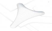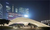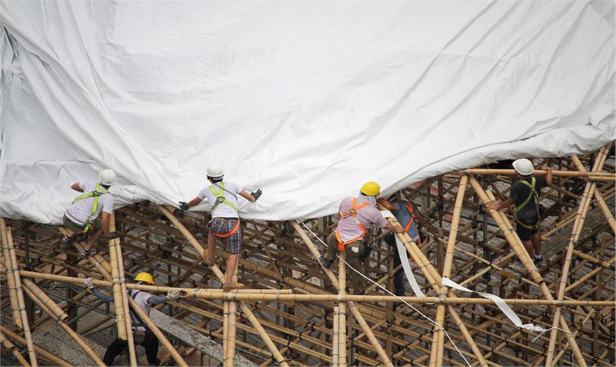整個網(wǎng)架結(jié)構(gòu)以475枝大竹組成,竹在施工時屈曲,并以廣東傳統(tǒng)搭棚技術(shù)用金屬線將竹扎緊。竹亭的外形由三角網(wǎng)格結(jié)構(gòu)向下折疊而成,組成的三個空心柱固定于混凝土地基上,并蓋上量身定做的亞加力纖維布料作遮擋風雨用途,射燈則從空心柱中擦亮整個竹亭。