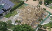 竹亭的高度相等于四層樓高、覆蓋面積為350平方米、是一個可容納二百個座位的大跨度彎曲主導網(wǎng)架結(jié)構(gòu)。
