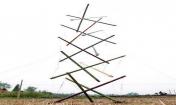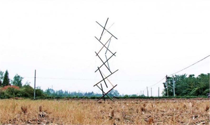 第九屆中國竹文化節(jié)開幕現(xiàn)場, 10米高竹塔,15根彩色原竹,漂浮并消隱在城市背景和熱鬧的展會人群中。會后,竹塔由四位工人抬著經(jīng)過縣城街道,整體安置在鄉(xiāng)村稻田中,成為稻田中的公共藝術(shù)。2017年,春暖花開,油菜花海,經(jīng)過半年的耐力試驗后,竹塔將被拆解,竹竿和鋼索被分類回收等待新的利用。 再見漂浮的五彩原竹。