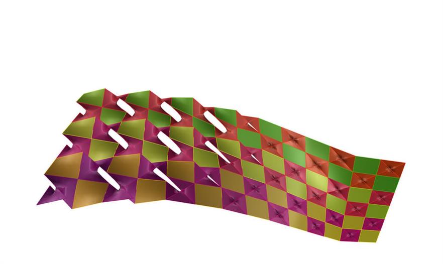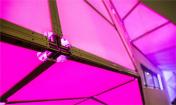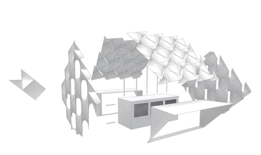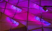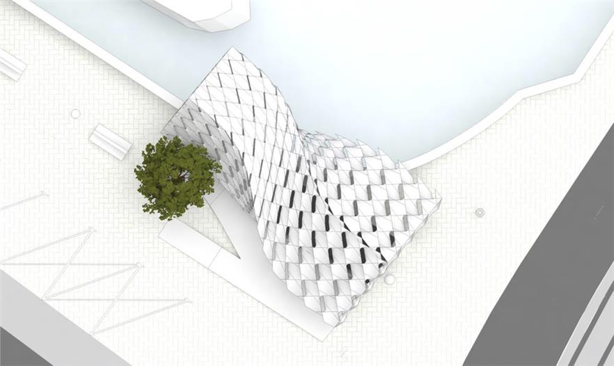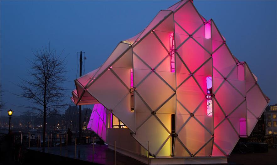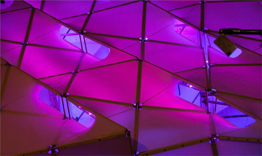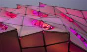 2個(gè)不同長度的旋轉(zhuǎn)線構(gòu)成曲折的結(jié)構(gòu),但需要參數(shù)優(yōu)化面板,以獲得有效地裝配和安裝。拉伸紡織模塊表面有開口,這樣人們還能瞥到室內(nèi)景色。由于拉伸結(jié)構(gòu)里面安裝了LED燈,亭子表面呈現(xiàn)出漸變的顏色。