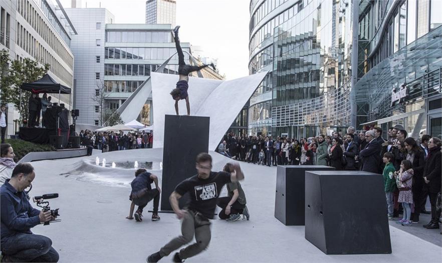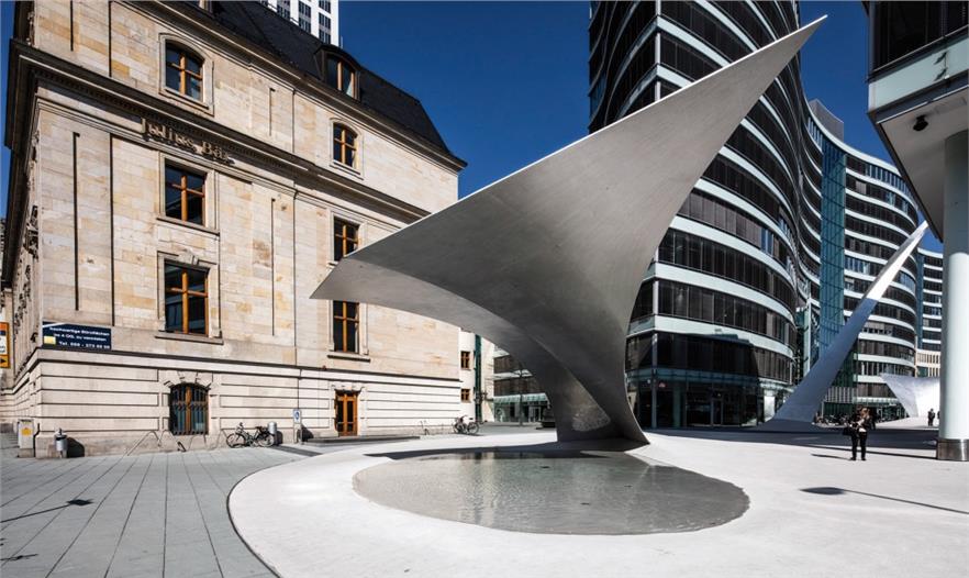 最終的成品由六段在整個建筑群空間內流動的波浪狀結構組成。其中三段自地面弓起形成高度不同的拱形。自歌劇院廣場方向前來,一座高約7米的“下淺的拱形”首先出現(xiàn)進而明顯的潛入地表,為的是以隨后“壯麗的拱形”出現(xiàn),接近18米的高度扭曲成一座半圓形的舞臺。隨后鋁制雕塑翻轉成為7米高的“愉悅的波浪”——形成通向地下停車場的電梯與樓梯的屋頂,與之前“流動的波浪1和2”相比更加平緩,并消失于終點“舒緩的波浪”。