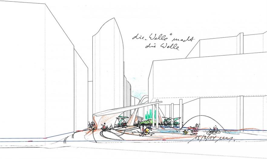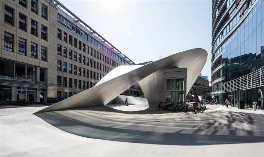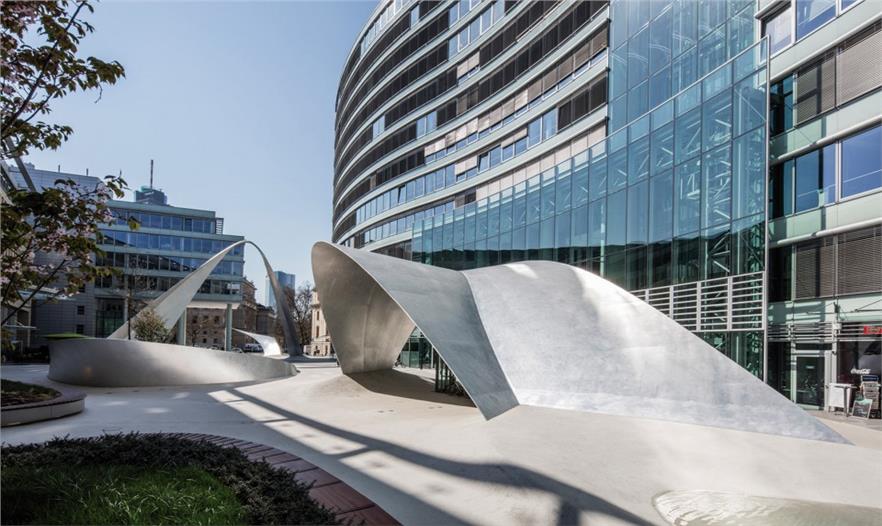 這個項目意在提升位于美茵河畔法蘭克福老歌劇院附近的“浪潮”辦公綜合體的室外景觀。施耐德+舒馬赫事務所對這一新設計的初始靈感來源于這處綜合體的名稱“浪潮”,這個稱呼與辦公建筑曲線的外立面形成了共鳴。施耐德+舒馬赫事務決定將這一概念繼續(xù)發(fā)展并探索它的深度:設計一段在空間中流動的三維曲線,吸引注意力的同時喚起好奇心?!爱斘覀兛吹揭患梢怨┪覀兺渡渥陨硐胂罅?、經歷與記憶于其上的設計,它便會喚起共鳴與情感來激發(fā)我們的興趣?!?施耐德+舒馬赫建筑設計事務所創(chuàng)始人米歇爾.舒馬赫教授如此解釋道。