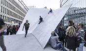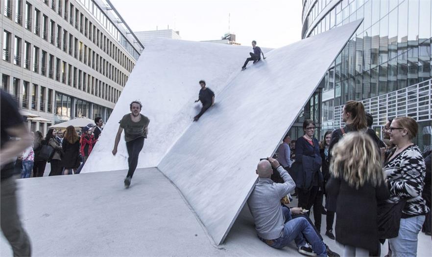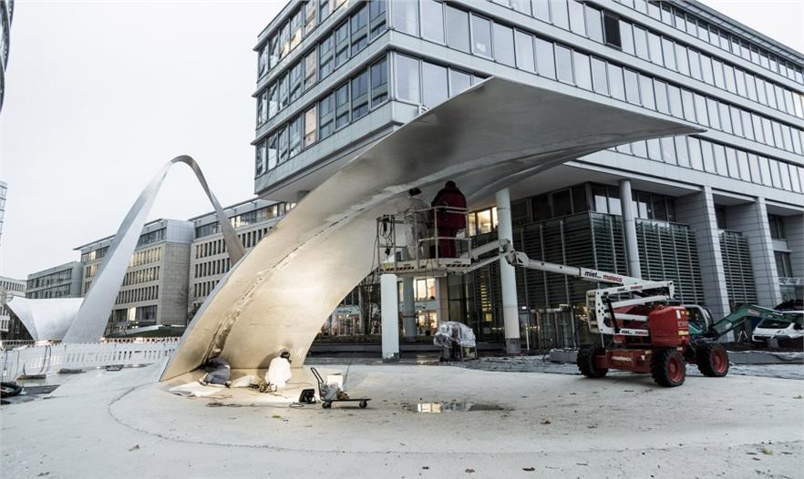 整個雕塑的第一部分——“愉悅的波浪”——在2015年7月底建造完畢,九月中旬,“壯麗的拱形”隨后建造完成。這座最高的鋁制拱形花了三天時間來組裝其三個部件。自2015年末,路人們便已可以在完成的鋁制雕塑中間體會其帶來的樂趣,而最終的結果便是一處融合了建筑與藝術的極富吸引力的城市空間。
