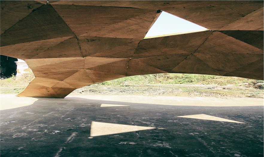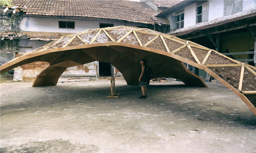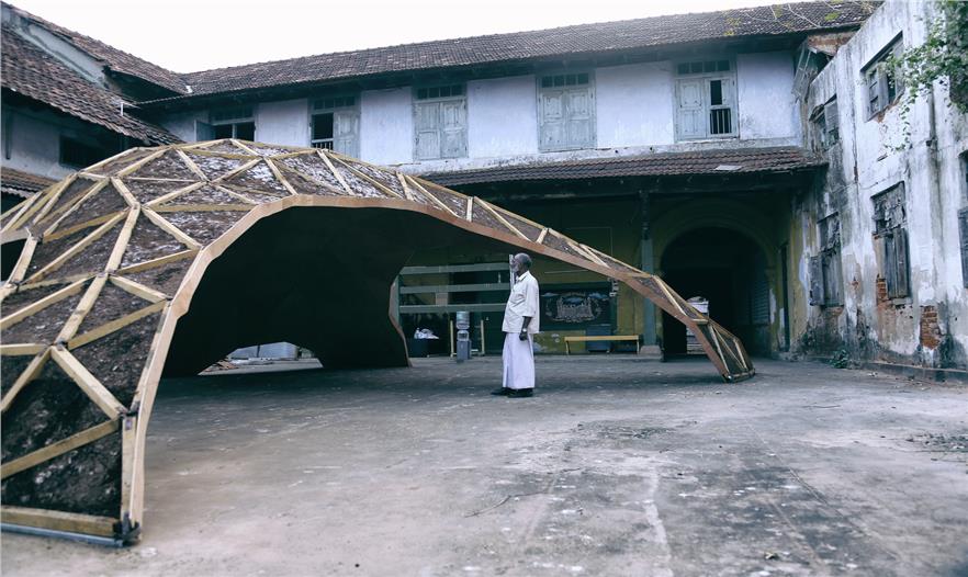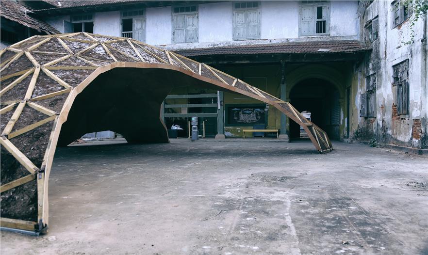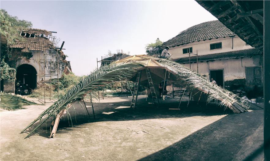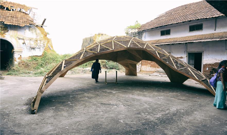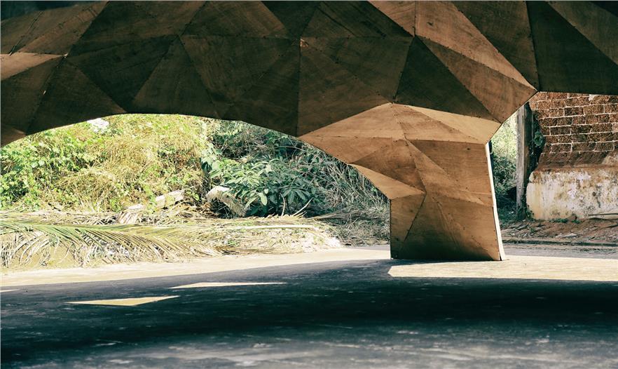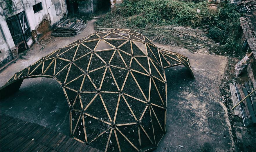 菌落庭院由兩家建筑事務(wù)所BEETLES3.3 和Yassin Areddia Designs聯(lián)合設(shè)計(jì),通過展現(xiàn)臨時(shí)性的結(jié)構(gòu)傳達(dá)出一種可替代的有意識(shí)的設(shè)計(jì)概念。它曾作為2016年的高知-穆澤里斯雙年展(KochiMuziris Biennale 2016)的參展項(xiàng)目在印度進(jìn)行展出,目前從屬M(fèi)AP項(xiàng)目并放置在荷蘭倉庫(Dutch Warehouse)中。