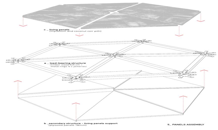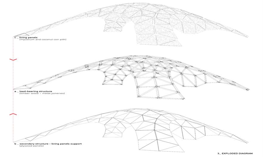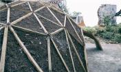 杳無人跡的商場(chǎng)靜默地佇立在廢棄住宅樓一旁,肅穆的樓宇因?yàn)轫?xiàng)目的擱淺而被遺忘在天空覆蓋之下。多處奧運(yùn)會(huì)會(huì)館成為“遺跡”,賽事的盛大和歡呼隨著最后一位工作人員的離開成為建筑體遙不可及的遐想,因?qū)扌徒ㄖY(jié)構(gòu)的嚴(yán)格審查,這些龐然大物最終無法融入市民的生活之中。它們從被誕生到被遺忘,曾經(jīng)被視為現(xiàn)代文明發(fā)展的象征,最終難逃人類的遺棄。捫心自問,人類執(zhí)手的混凝土建筑真的是建筑進(jìn)步的標(biāo)志嗎?如果是,我們何以狠心將它們棄之不顧?一群設(shè)計(jì)師說:“我們批評(píng)用無意識(shí)的態(tài)度去設(shè)計(jì)一棟建筑,建筑從無到有,再從有到無的過程,充斥著看不見的殘酷”。為了讓更多人知道他們的宣言,讓更多人理解可持續(xù)性發(fā)展,這群設(shè)計(jì)師建造了一個(gè)殼菌絲館形狀的“菌落庭院“(The Shell Mycelium Pavilion) 。